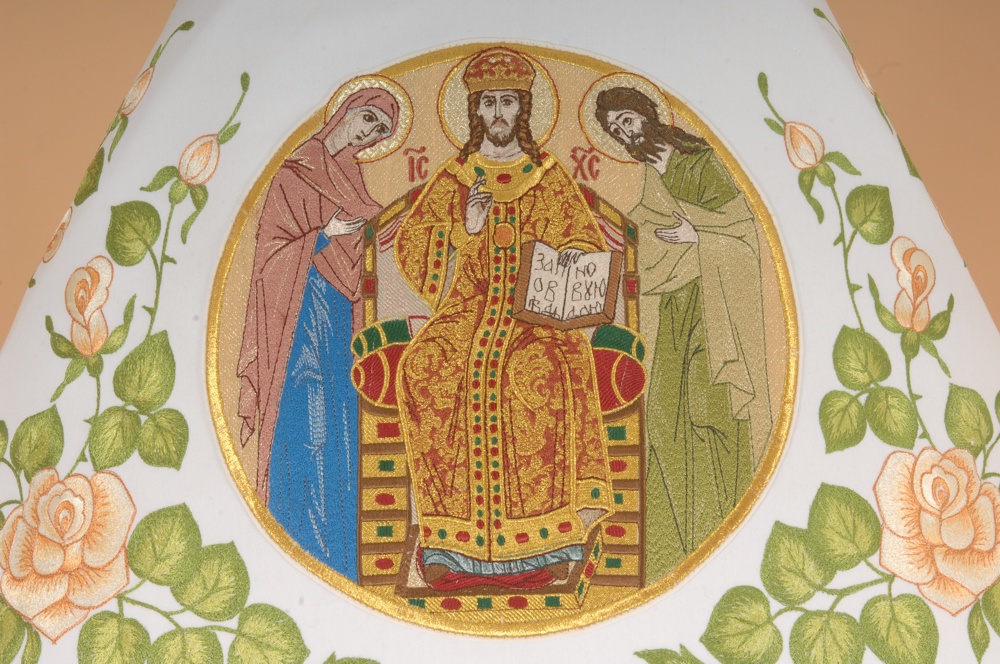 Отделочные элементы: вышитый галун по ткани, вышитые кресты, бахрома, вышитая икона, машинная вышивка по всей ткани в технике гладь.