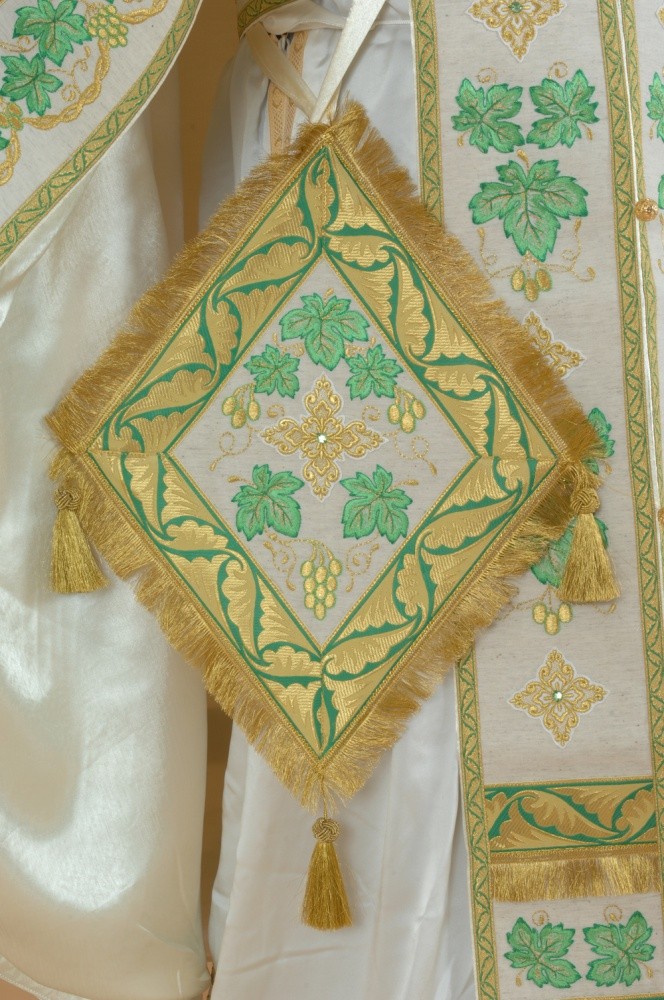 В комплект входит: фелонь, епитрахиль, поручи, пояс, набедренник, палица.