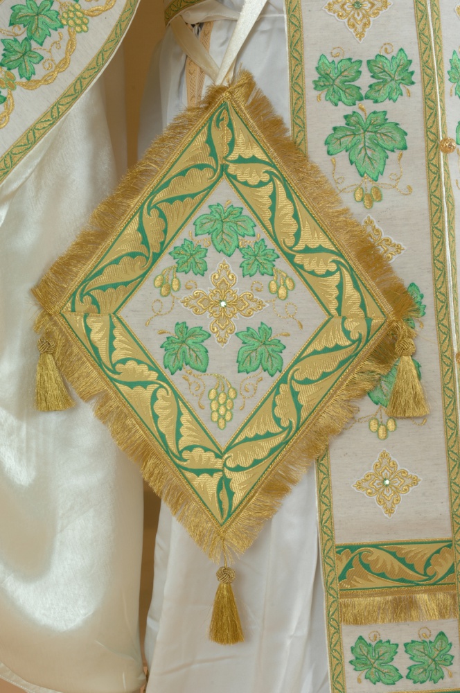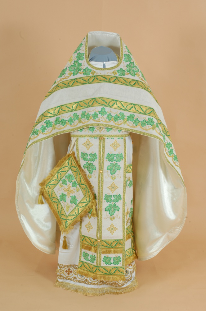 В комплект входит: фелонь, епитрахиль, поручи, пояс, набедренник, палица.