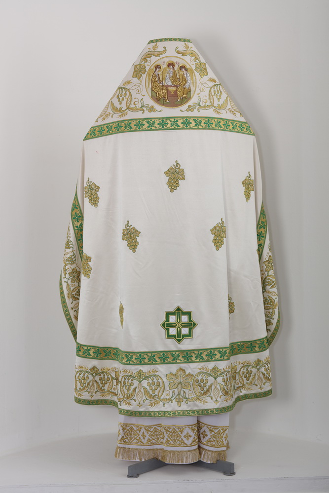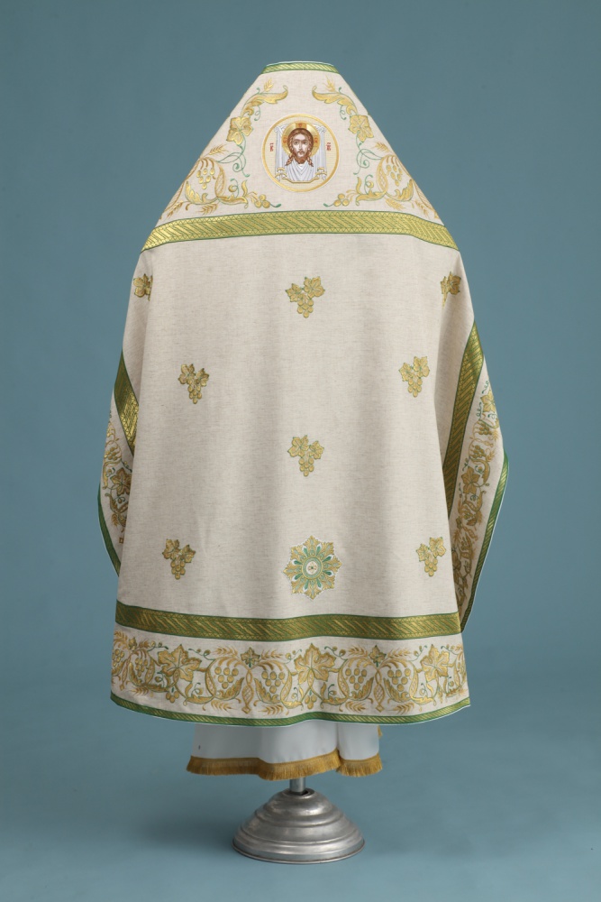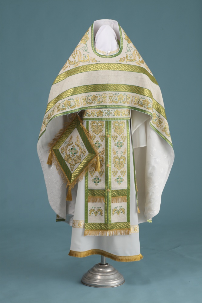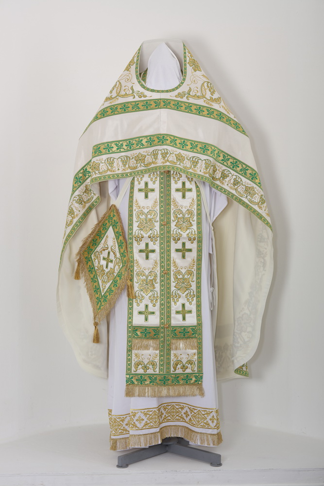 В комплект входит: фелонь, епитрахиль, поручи, пояс, набедренник, палица.