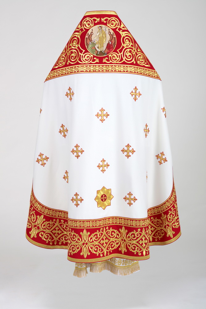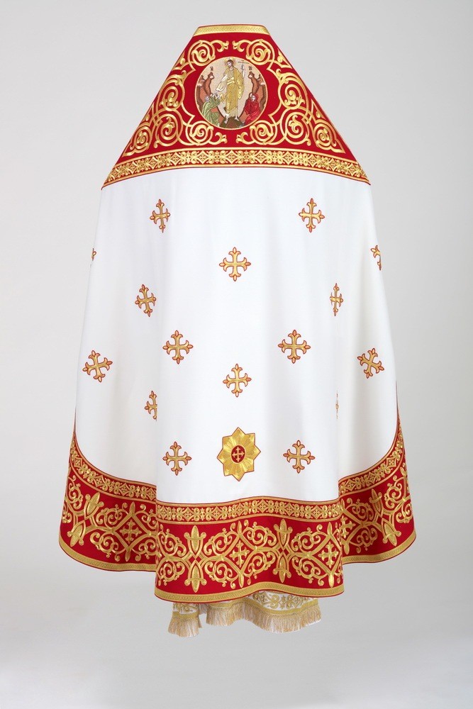 Отделочные элементы: вышитый галун по ткани, вышитые кресты, бахрома, вышитая икона в оплечье, автоматическая вышивка по всей ткани.