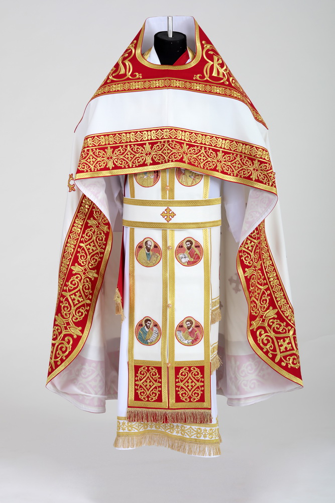 В комплект входит: фелонь, епитрахиль, поручи, пояс, набедренник, палица.