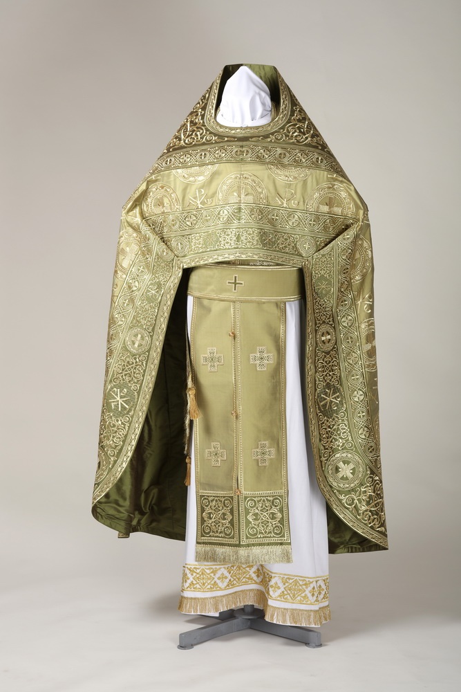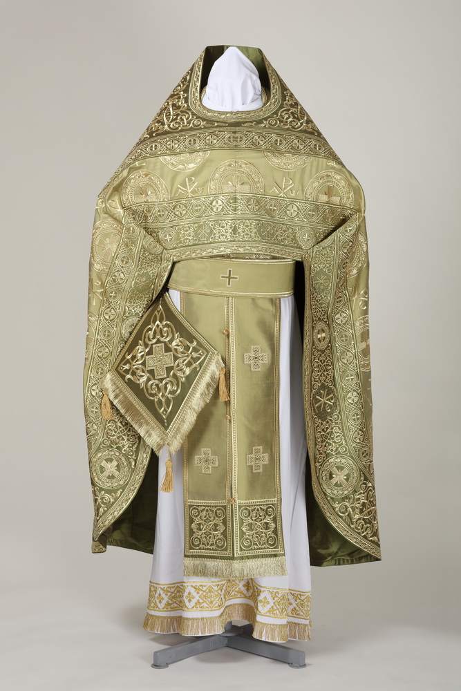 В комплект входит : фелонь, епитрахиль, поручи, пояс, палица, набедренник.