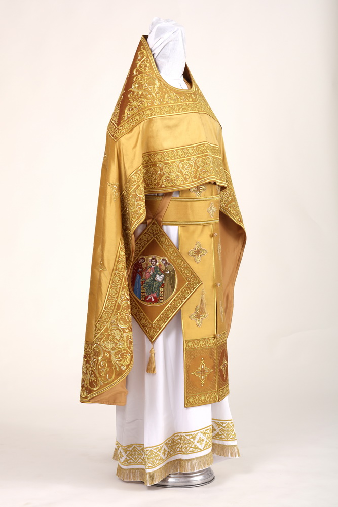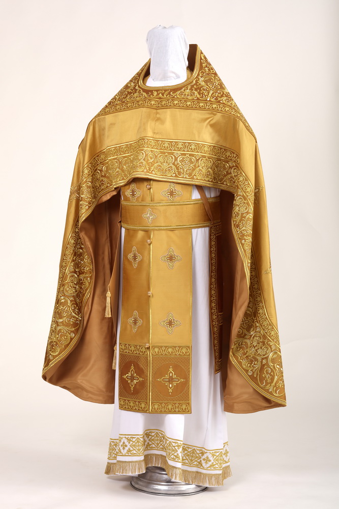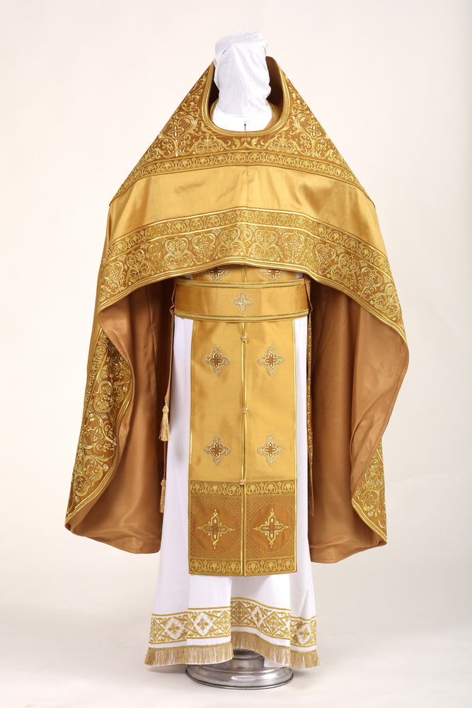 В комплект входит : фелонь, епитрахиль, поручи, пояс, палица, набедренник.