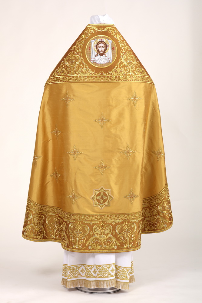 Отделочные элементы: вышитый галун по ткани, вышитые кресты, вышитая икона на палице , автоматическая вышивка по всей ткани.