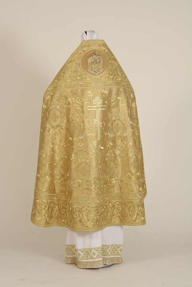 Отделочные элементы: вышитый галун по ткани,вышитые кресты, вышитые иконы в оплечье и на палице, автоматическая вышивка по всей ткани.
