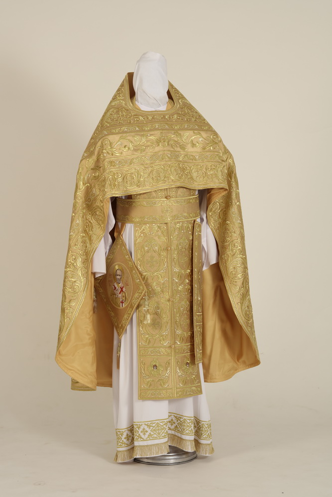 В комплект входит: фелонь, епитрахиль, поручи, пояс, набедренник, палица.