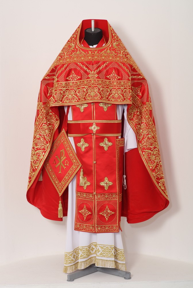 В комплект входит: фелонь, епитрахиль, поручи, пояс, набедренник, палица.