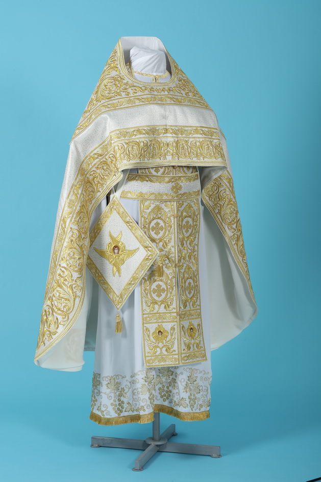 В комплект входит: фелонь, епитрахиль, поручи, пояс, набедренник, палица.
