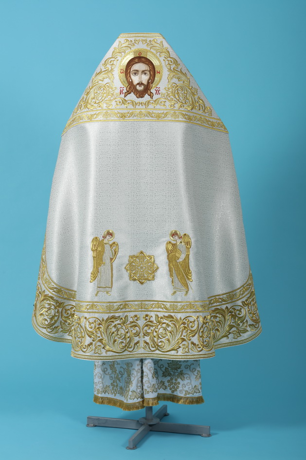 Отделочные элементы: вышитый галун по ткани,вышитые кресты, вышитые иконы в оплечье и на фелони, автоматическая вышивка по всей ткани.