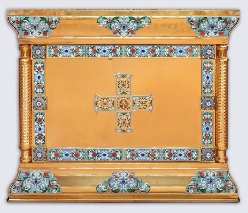 Торжественное и праздничное, металлическое облачение на жертвенник станет не только практичной церковной утварью, но и украшением алтаря. На золотом фоне красиво выделяются тонко прорисованные эмалевые узоры голубых, алых, зеленых и белых цветов. В центре боковые стенок расположены крупные четырехконечные кресты, а на углах жертвенника – рельефные колонны. Размер облачения составляет 960х960х1000 мм.