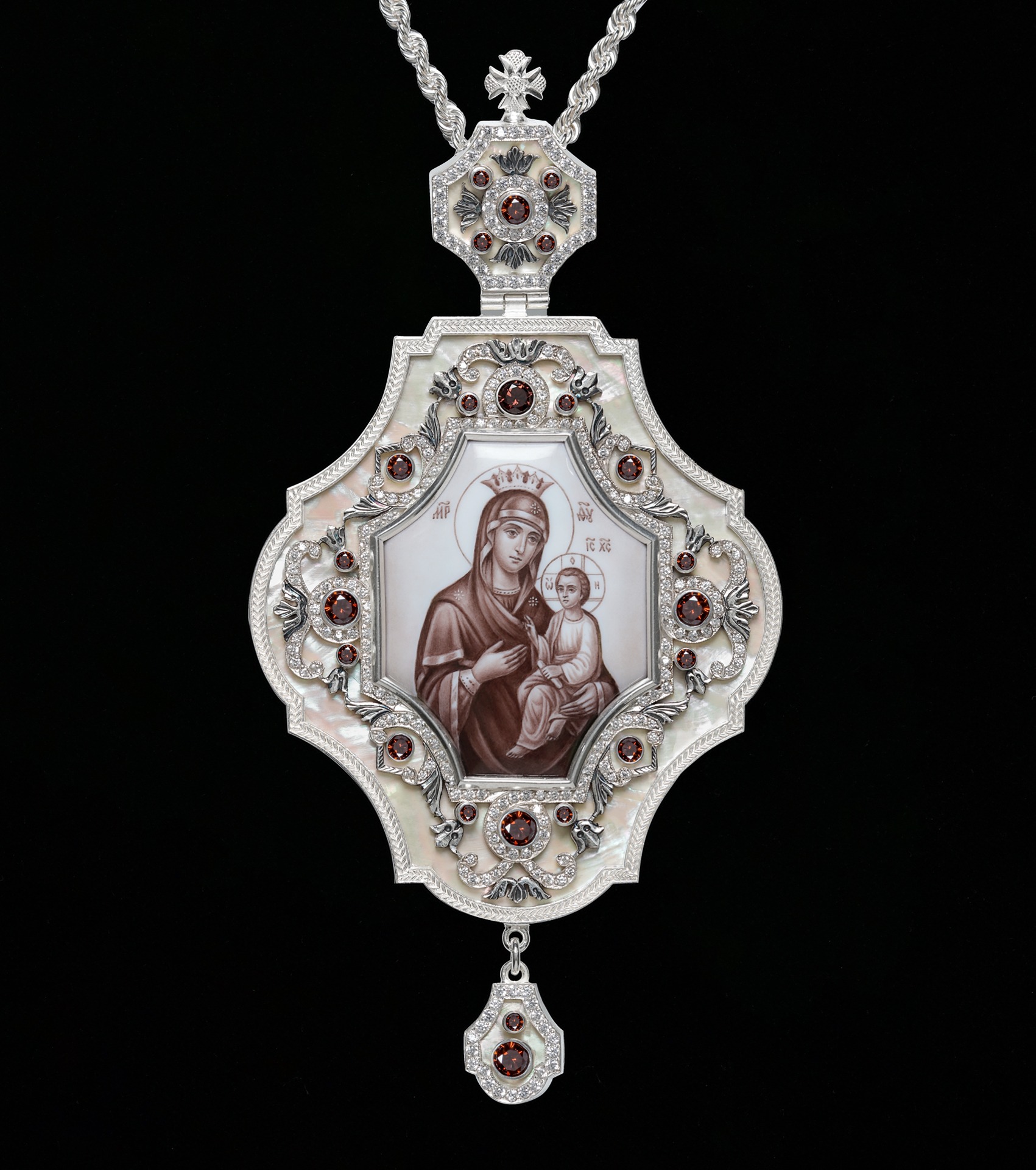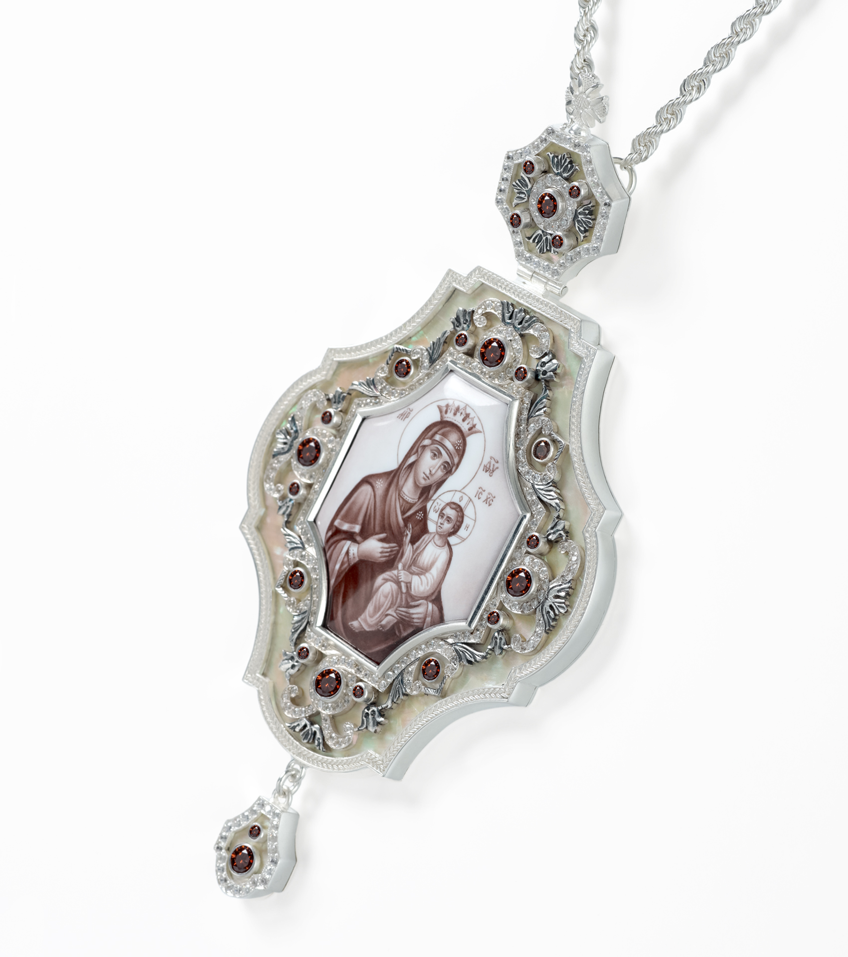 Панагия №200 / Фианиты перламутр серебро Скоропослушница БМ (УИН)