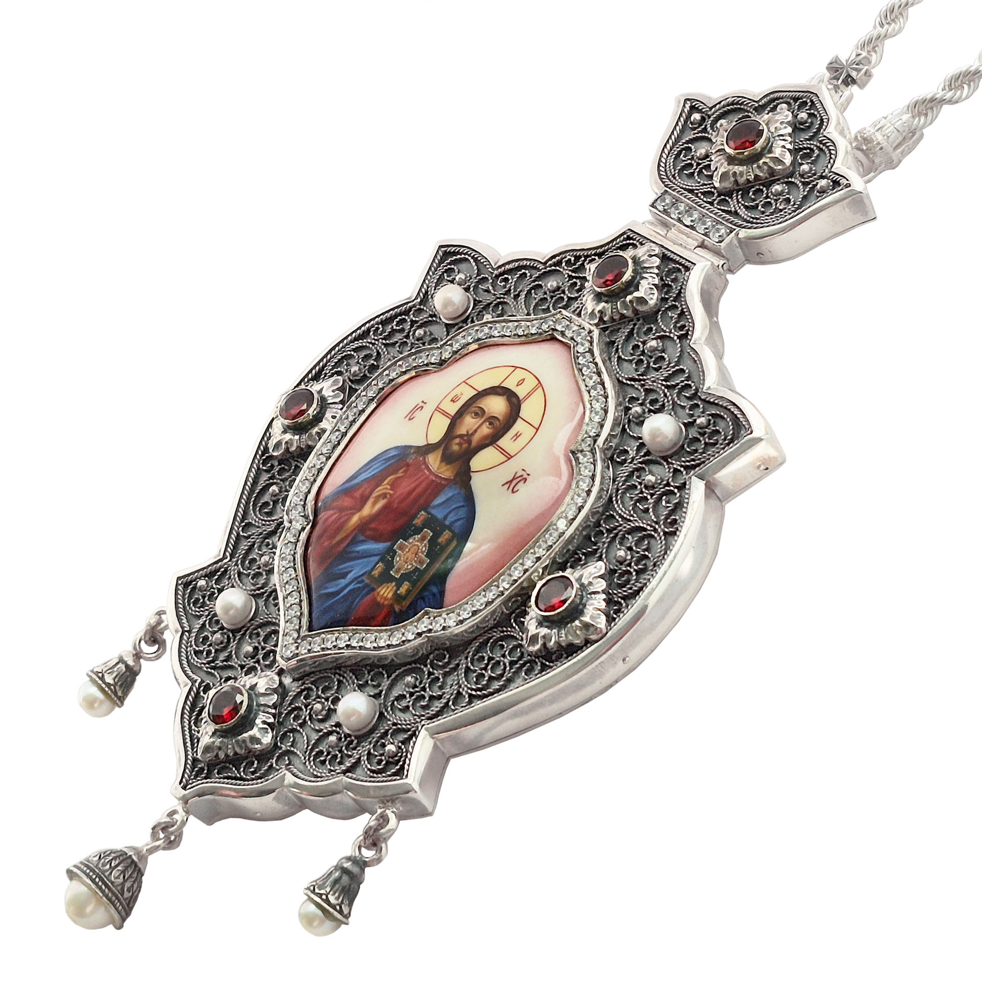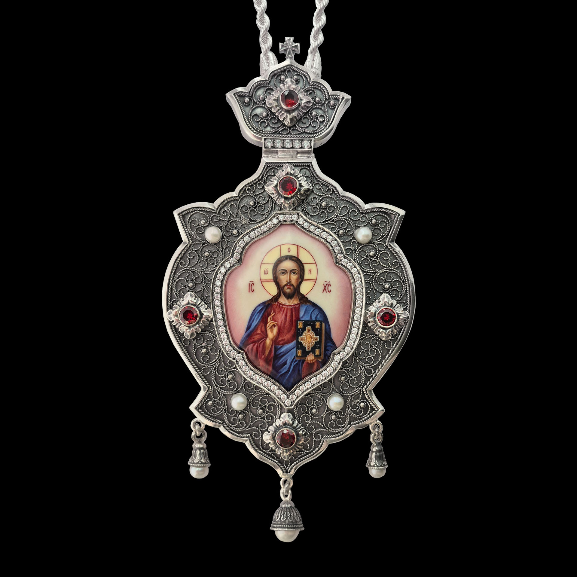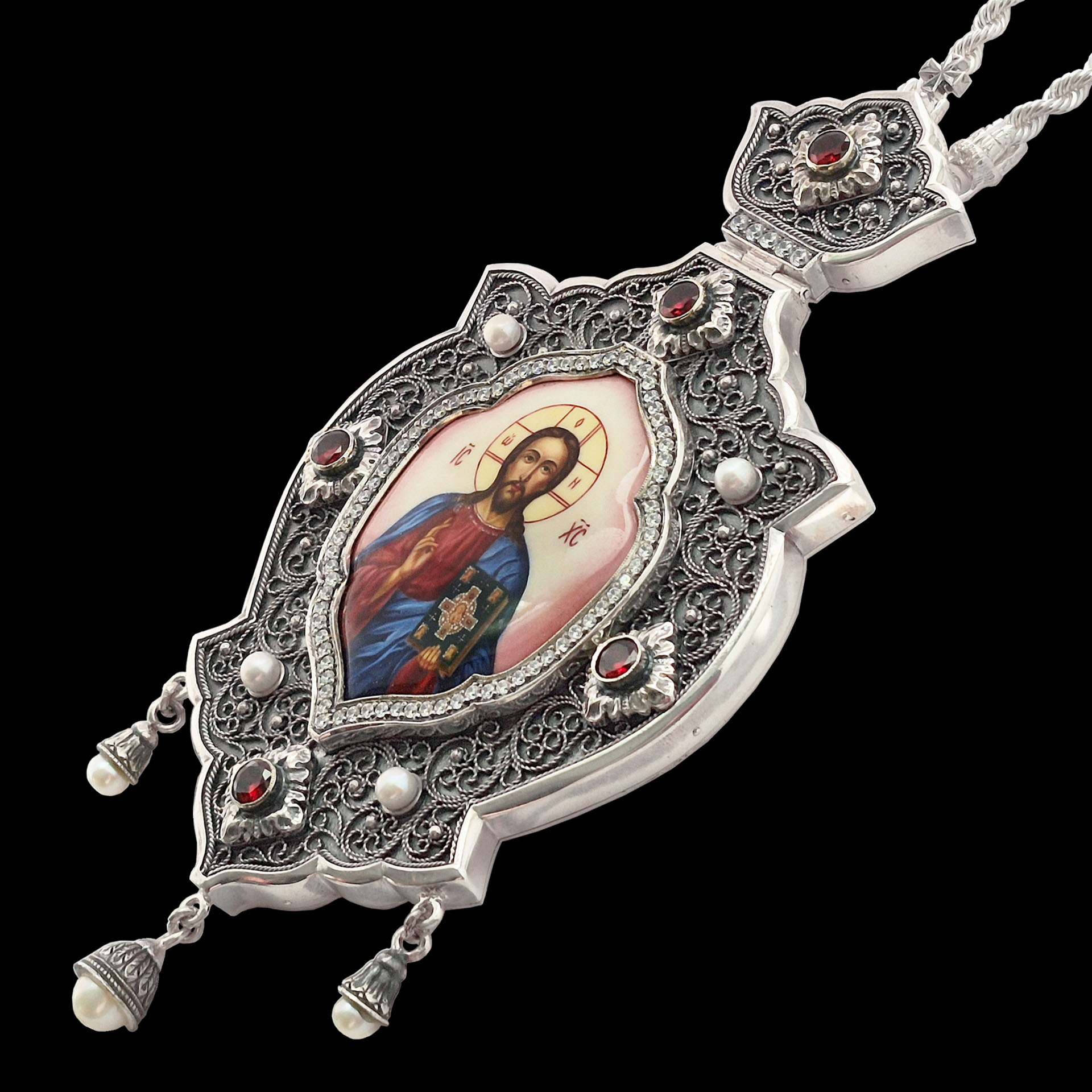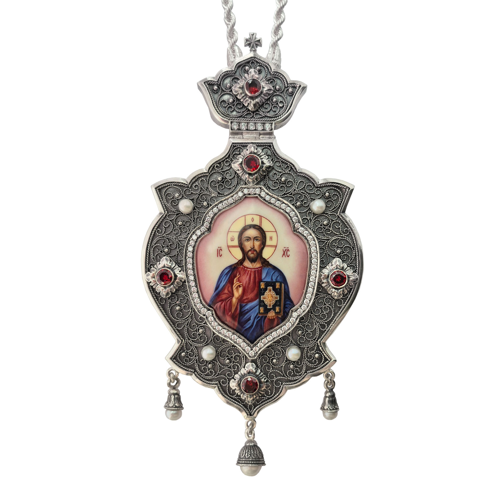 Панагия №227 / Фианиты финифть, филигрань серебро Господь Вседержитель (УИН)