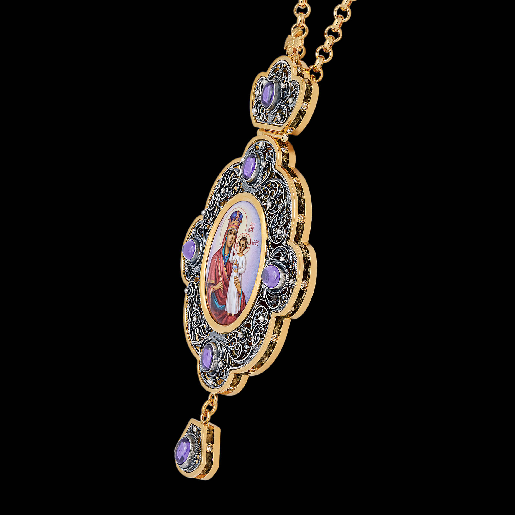 Панагия филигрань №0018 / Фианиты двойной рант финифть / золочение, серебрение