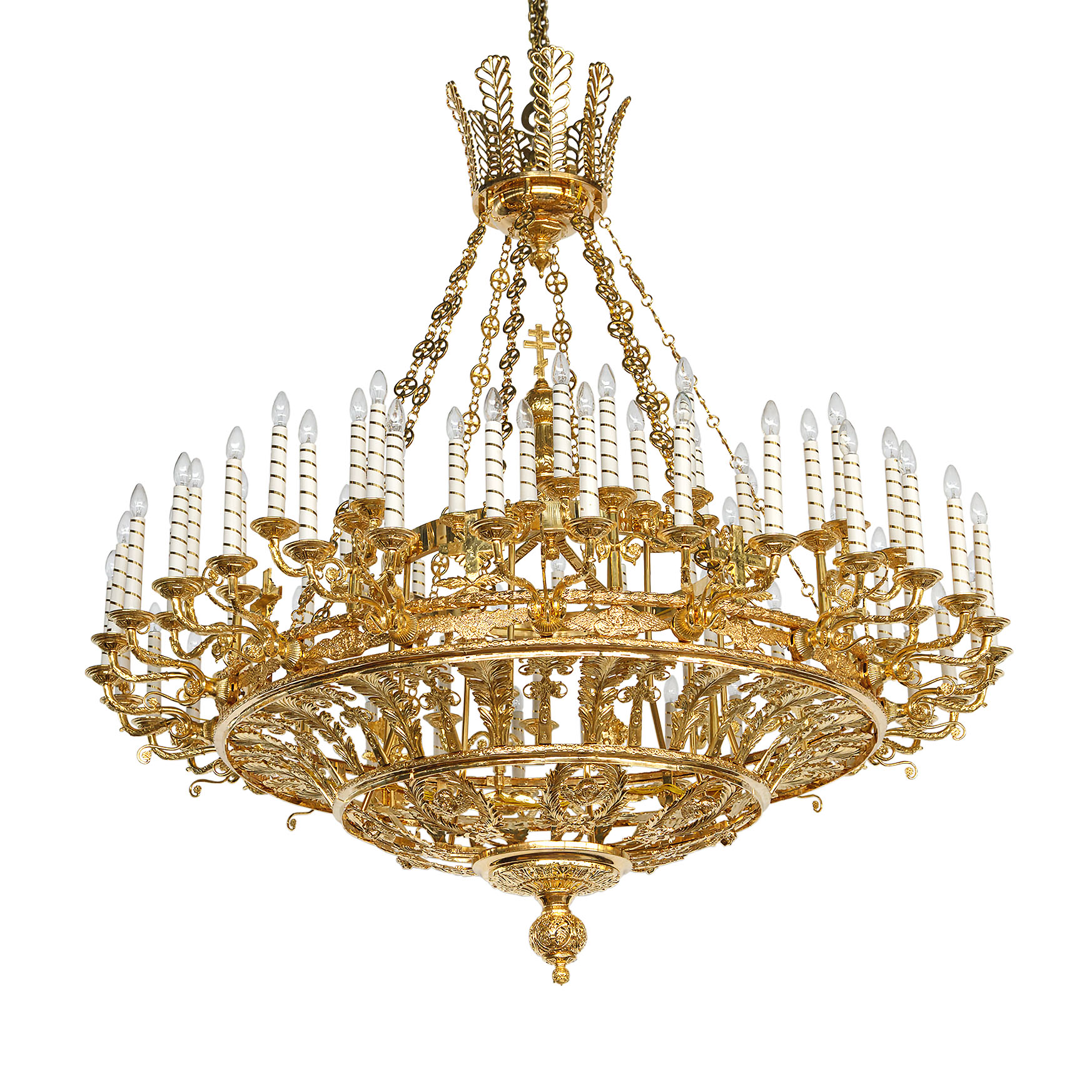 Паникадила комплектуются белыми свечами с золотой полосой (Свеча из жести, покрытая белой эмалью с золотой полосой).