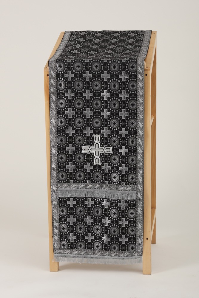 Отделочные элементы: галун (Россия), вышитый крест, бахрома.