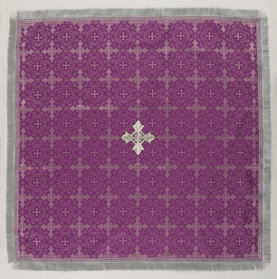 Отделочные элементы: галун (Россия), вышитый крест, бахрома.