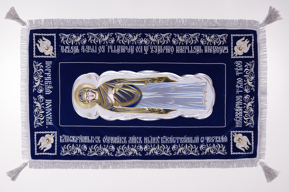 Плащаница выносная, изготовлена из немецкого бархата. Отделочные элементы - автоматическая вышивка, бахрома, тесьма, кисти.