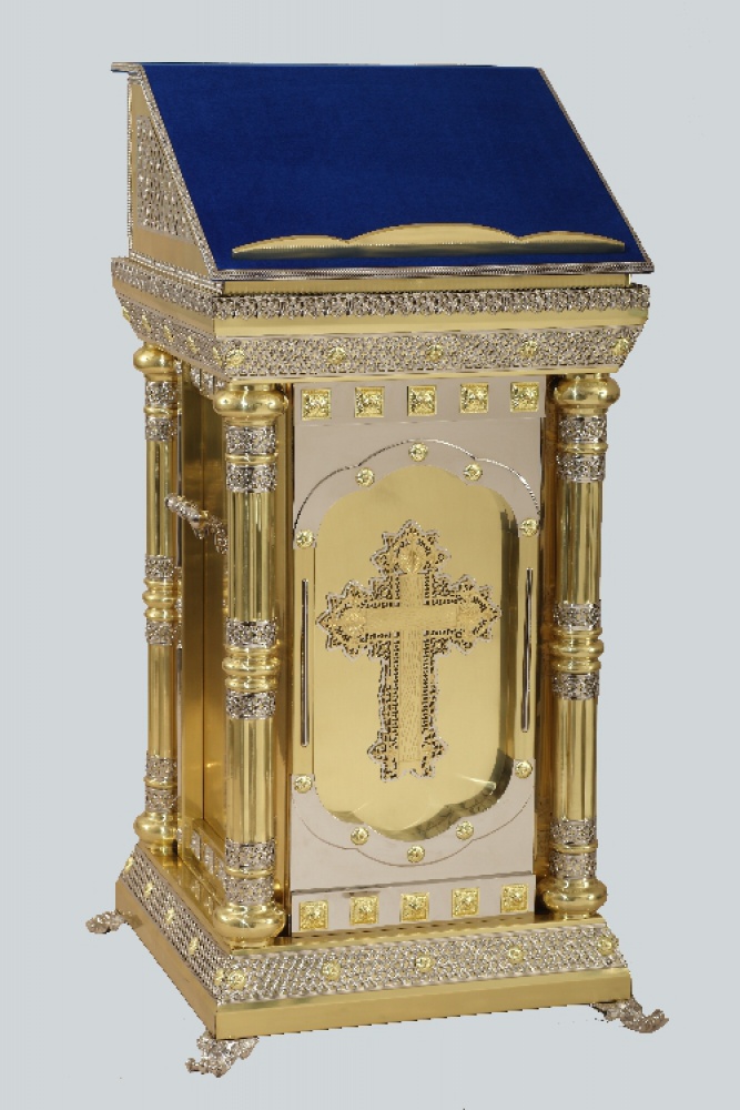 Благородный тумбовый аналой, украшенный позолоченными крестами и узорами, идеально подойдет на роль центрального аналоя. Удобный бортик и бархатное покрытие верха (цвет которого может быть изменен) уберегут икону от скольжения и падения.