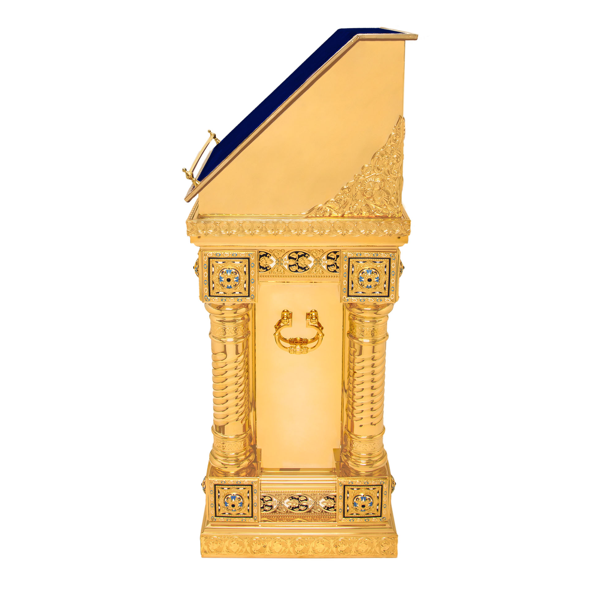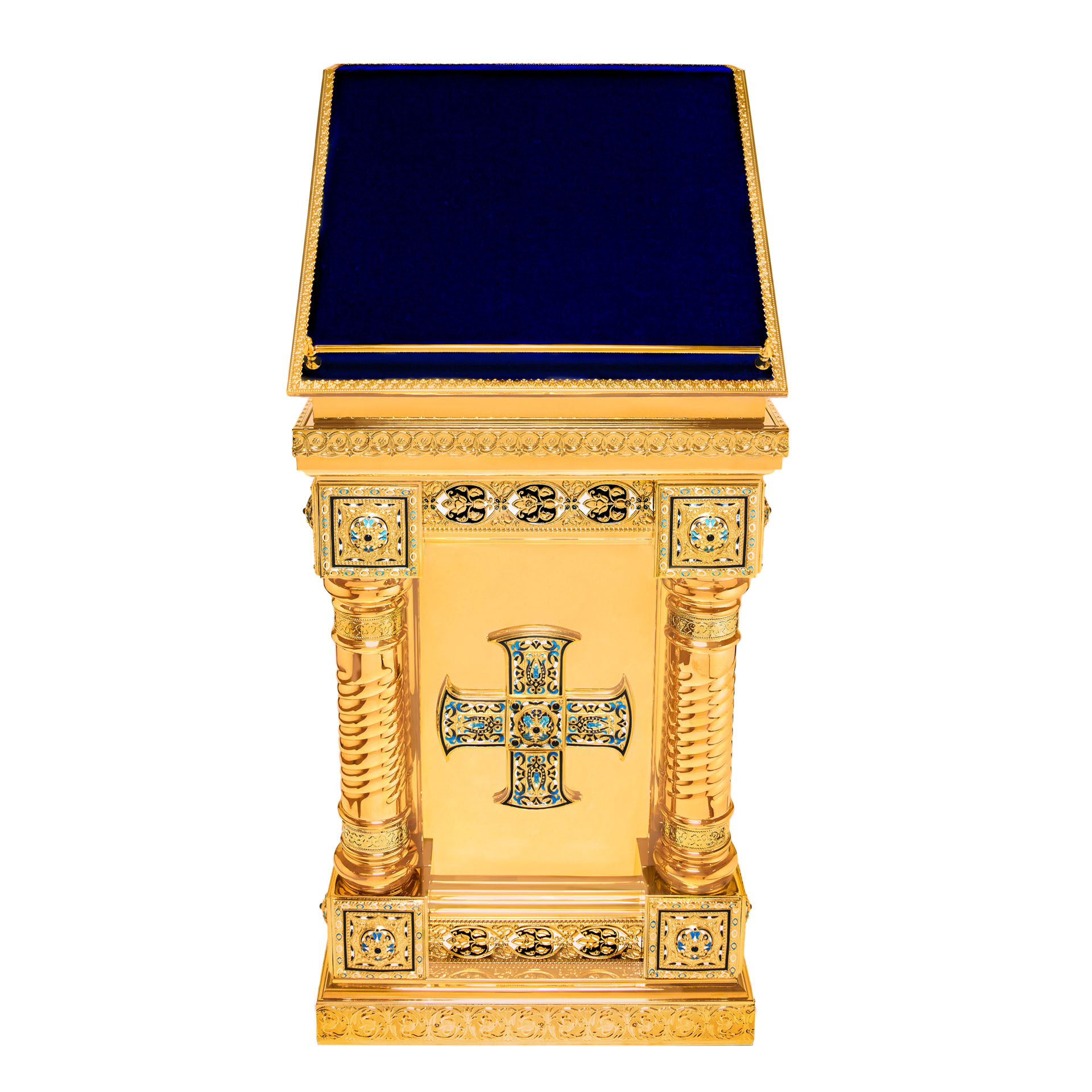 Позолоченный тумбовый аналой, украшенный минималистичными узорами, сияющими камнями и переливающейся эмалью, идеально подойдет на роль центрального аналоя в каменном кафедральном соборе. Удобный бортик и бархатное покрытие верха (любого цвета по Вашему желанию) уберегут икону от скольжения и падения.