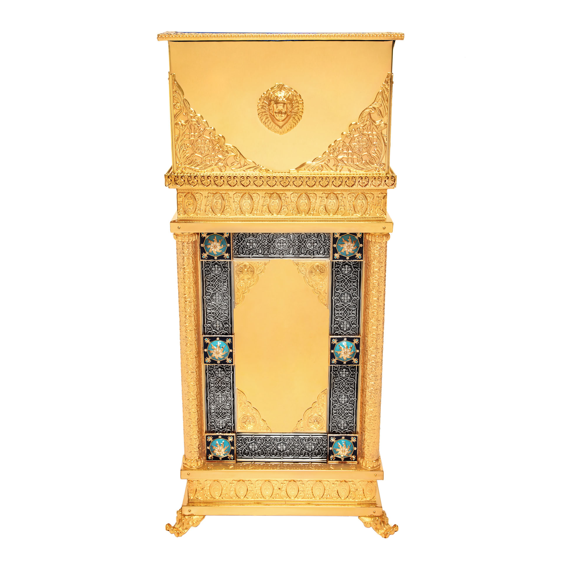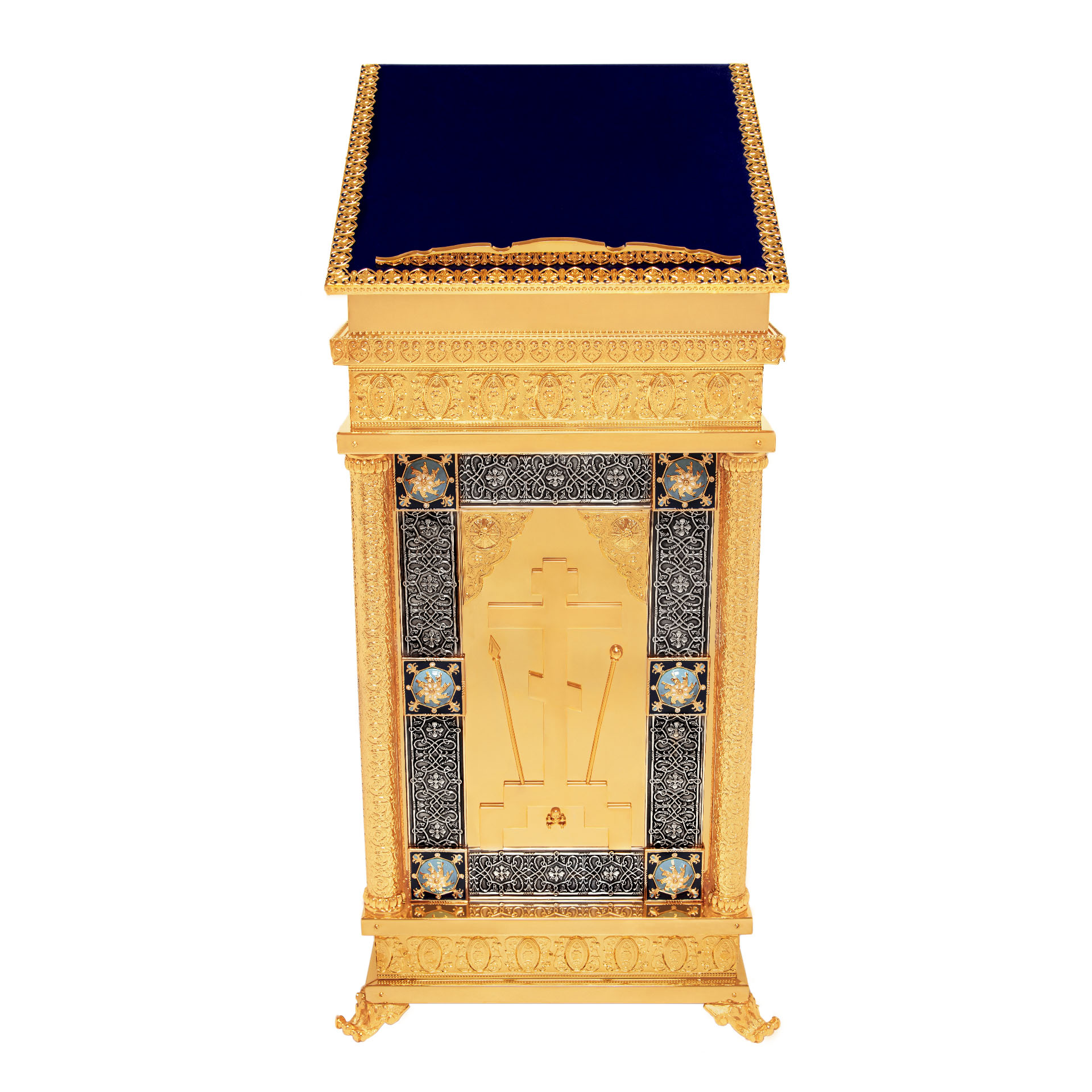 Позолоченный тумбовый аналой, украшенный крестом и переливающейся эмалью, идеально подойдет на роль центрального аналоя. Удобный бортик и бархатное покрытие верха (любого цвета по Вашему желанию) уберегут лежащую на аналое икону от скольжения и падения.
