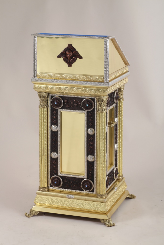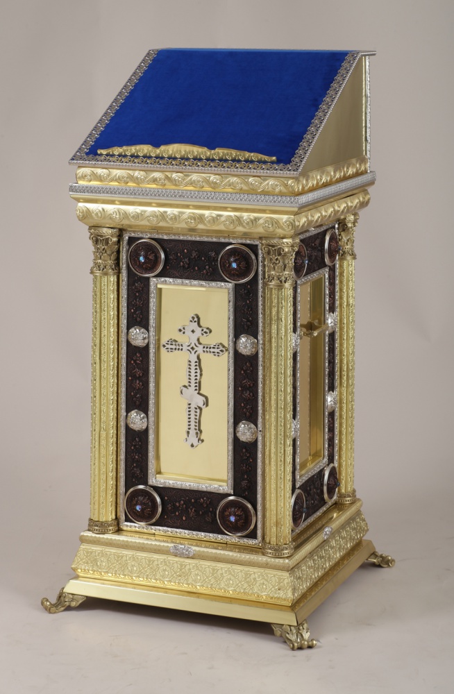 Изящный и устойчивый, тумбовый аналой с необычными минималистичными узорами идеально подойдет на роль центрального аналоя. Удобный бортик и бархатное покрытие верха уберегут икону от скольжения и падения.