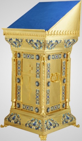 Позолоченный тумбовый аналой, украшенный яркими цветами из эмали под цвет обитого бархатом верха, идеально подойдет на роль центрального аналоя в кафедральном соборе. Удобный бортик и тканевое покрытие уберегут икону от скольжения и падения. По бокам у аналоя есть удобные круглые ручки, облегчающие его перенос.