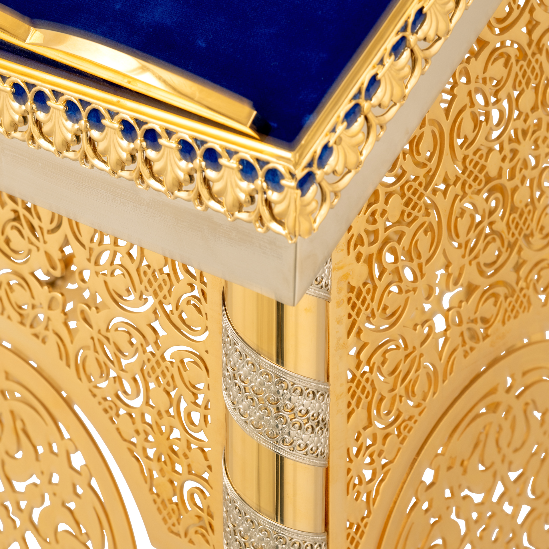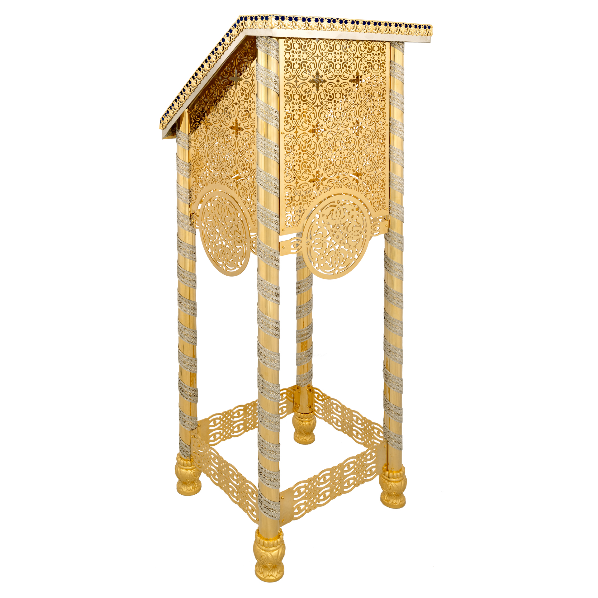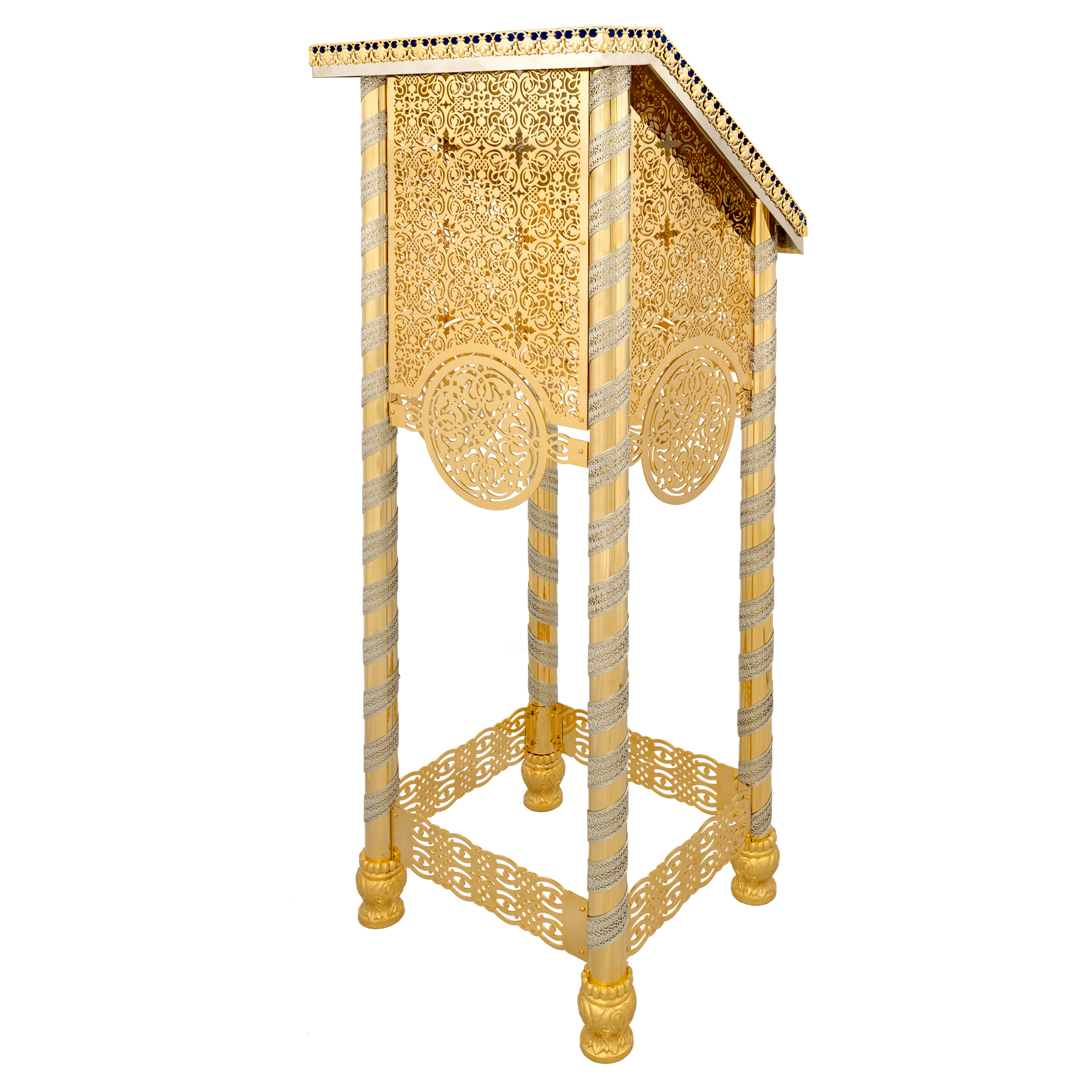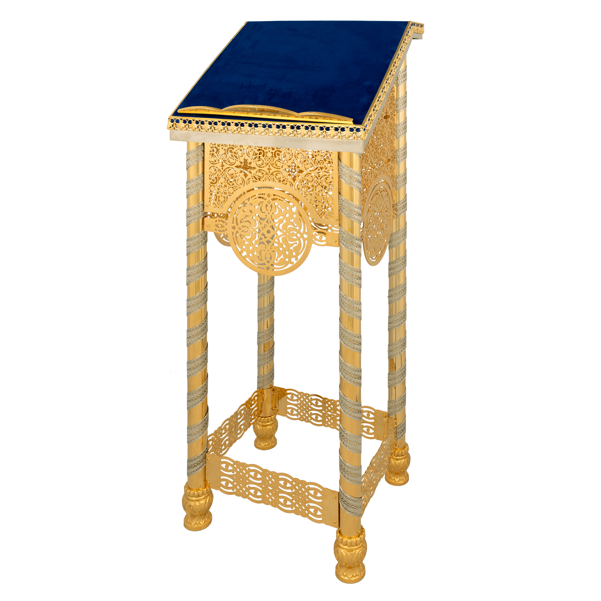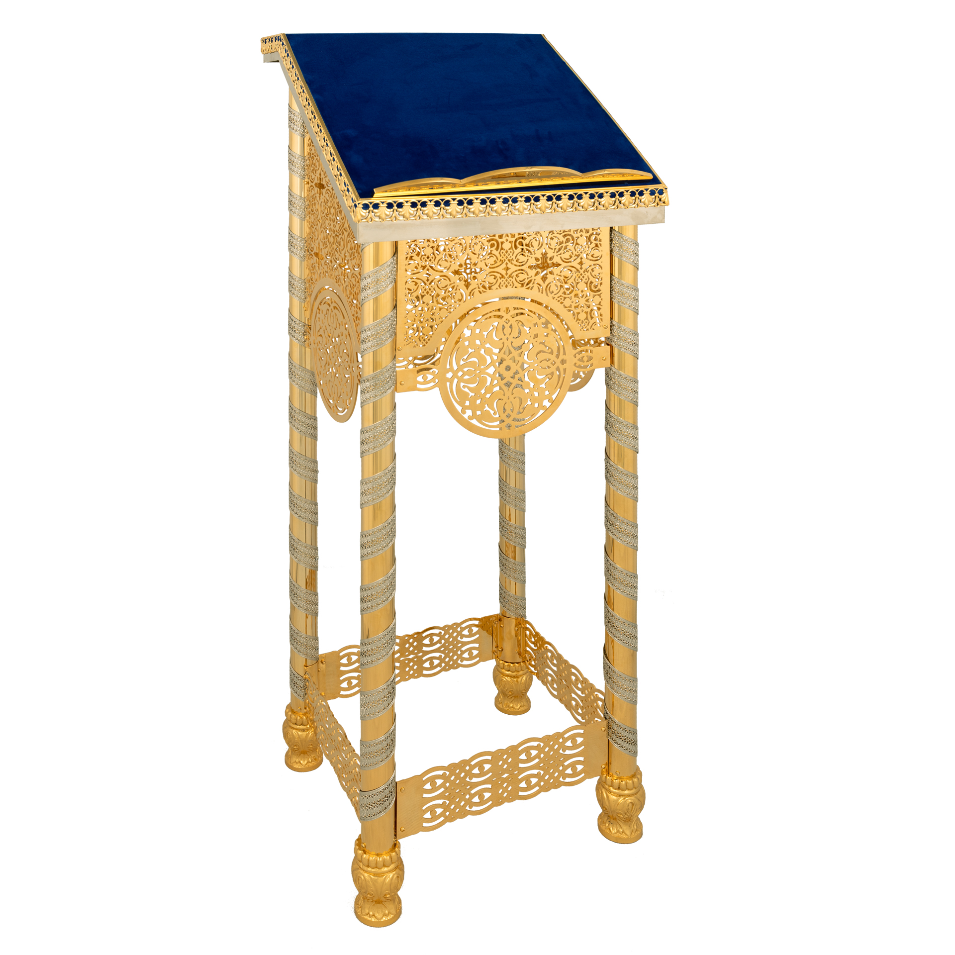 Данная модель аналоя на ножках подойдёт на роль центрального или бокового аналоя. Тонкие металлические узоры создают ощущение невесомости, делая аналой воздушным и изящным. Компактная конструкция позволит сэкономить место в храме, а бортик и бархатное покрытие верха уберегут икону от падения.