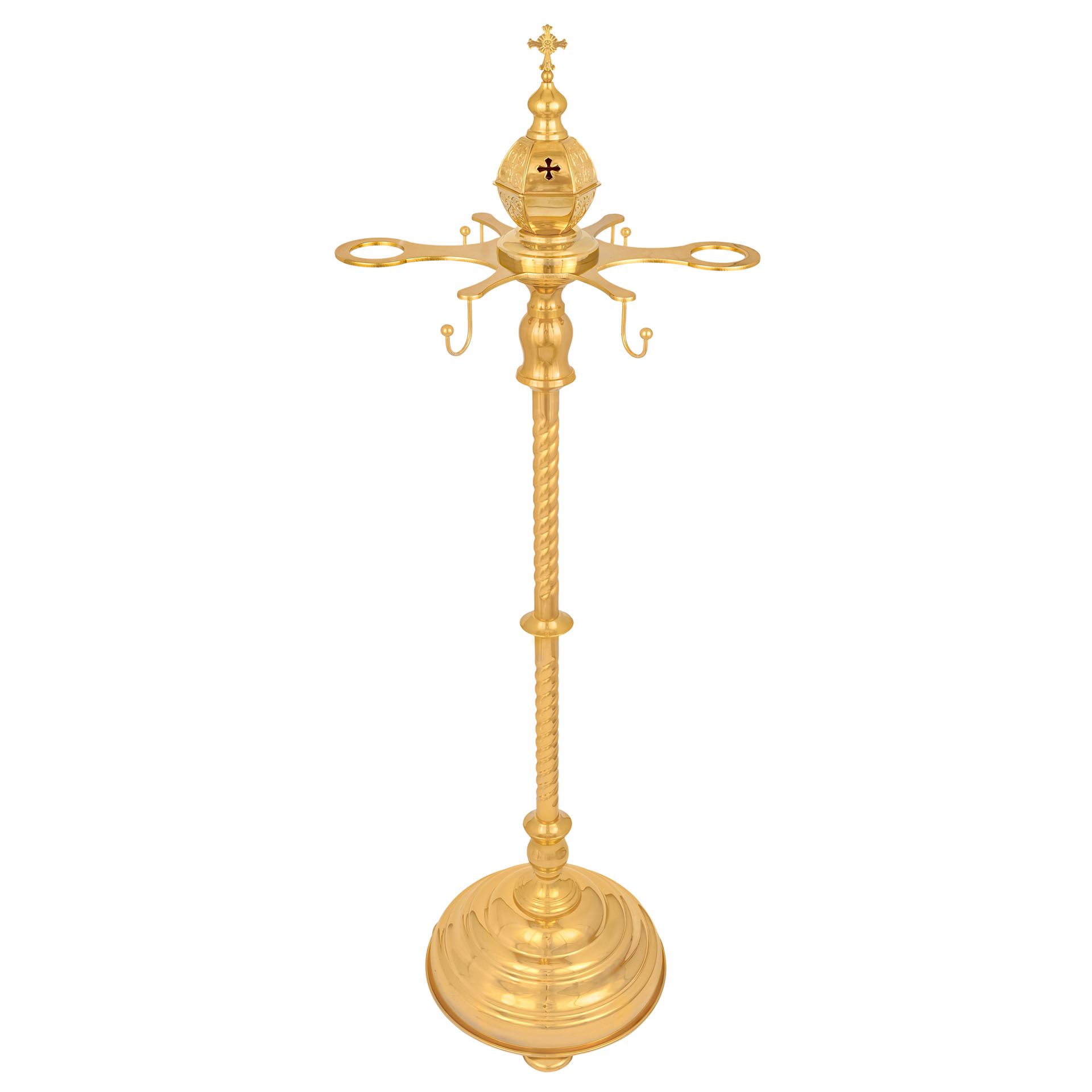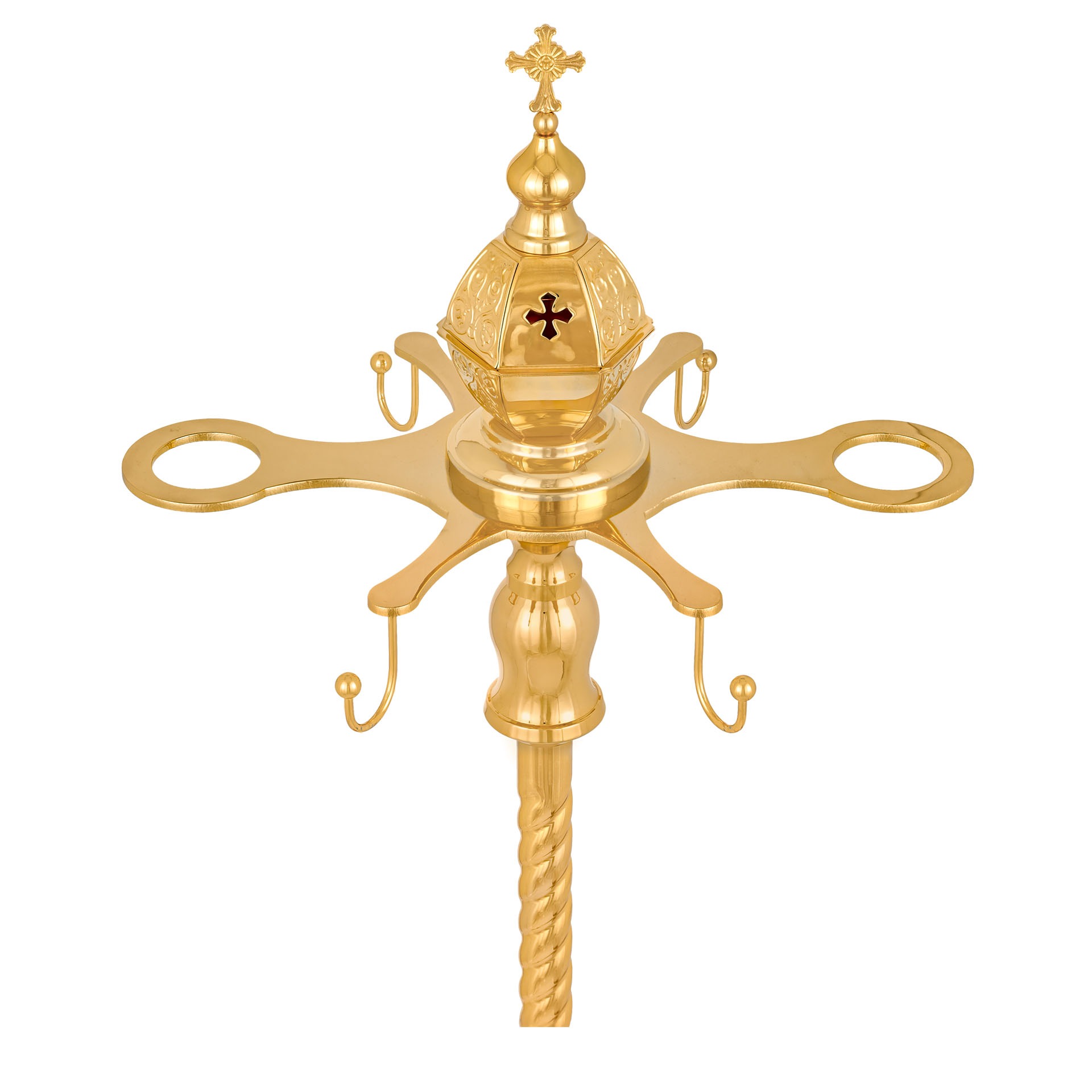 Изделие имеет два крепления под диаконские свечи и четыре крючка для кадил. В центре расположен сосуд для угля.