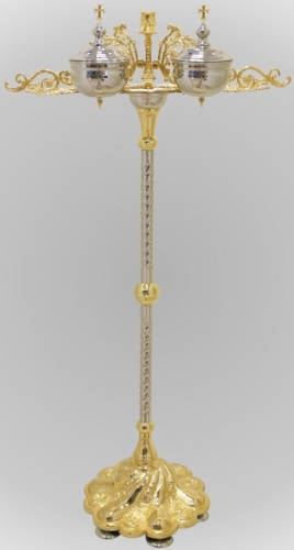 Изделие имеет два крючка для кадил. В центре расположены два сосуда для угля и ладана.