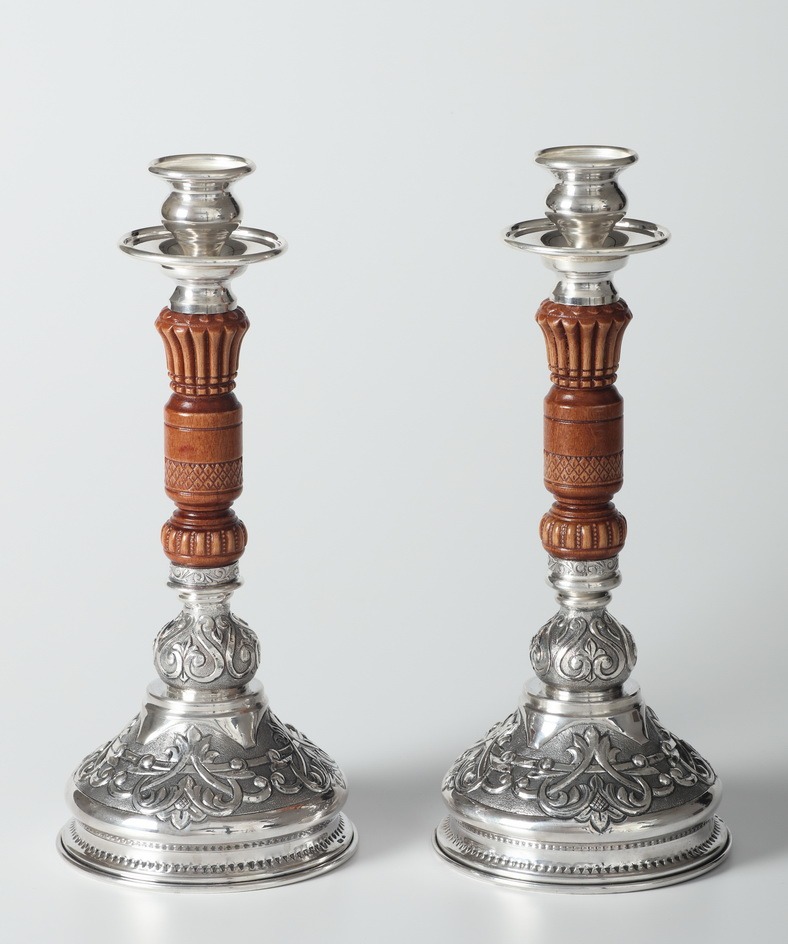 Подсвечник №8 / 2 свечи / с резьбой по дереву, чеканка серебро (УИН)