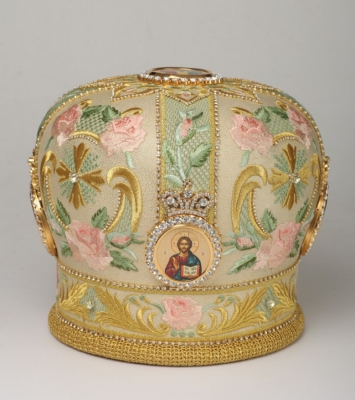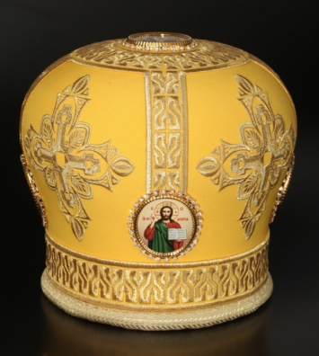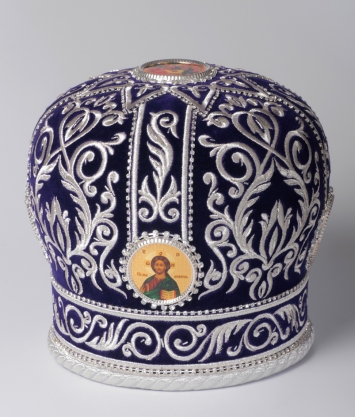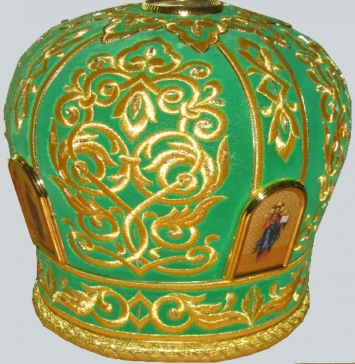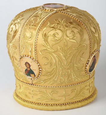 Митра ручная вышивка №542 глазет 4 вышитые иконы, крест юв.в футляре