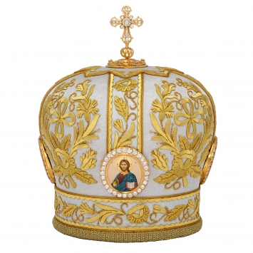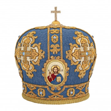 Митра ручная вышивка №551 габардин, канитель, юв.камни, лики вышитые 4 шт., юв.крест , футляр(п)