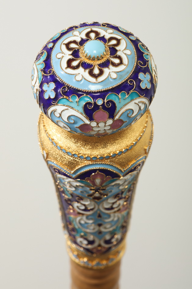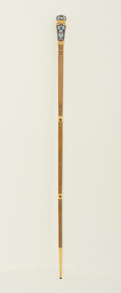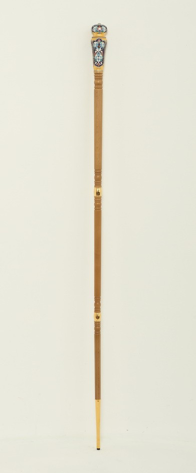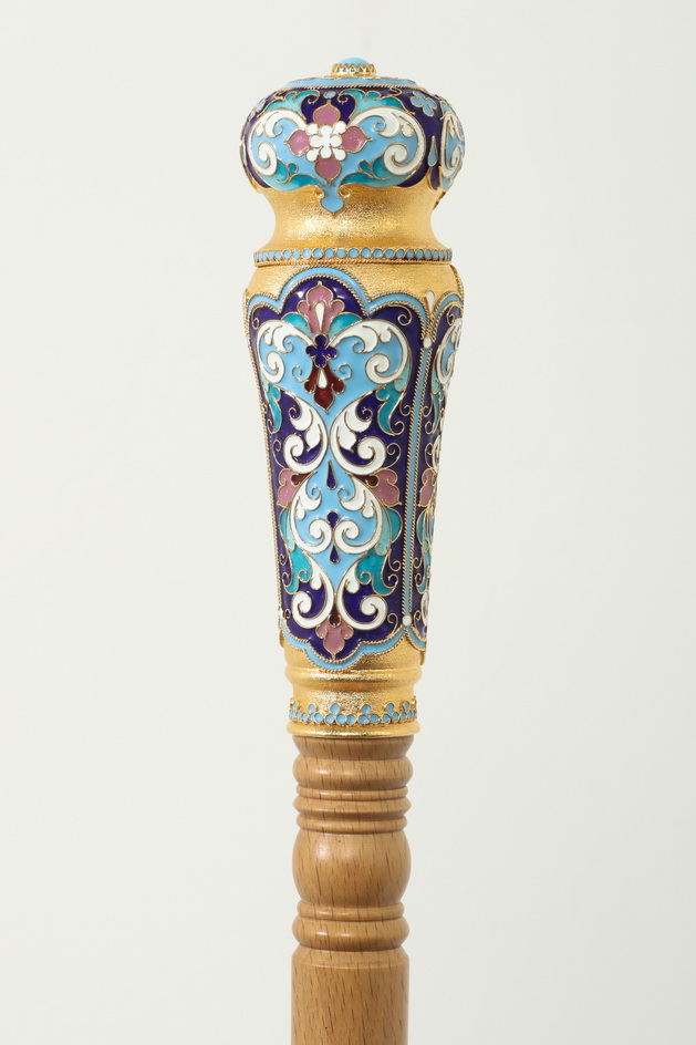 Изящный посох предназначен для внебогослужебного использования архиереем. Липовое древко приятного светло-орехового цвета разделено золотыми декоративными вставками на три части, что визуально придает изделию легкости. Позолоченный набалдашник украшен филигранными кружевами, яркими эмалевыми цветами и объемным камнем, цвет которого может быть измен по желанию заказчика.