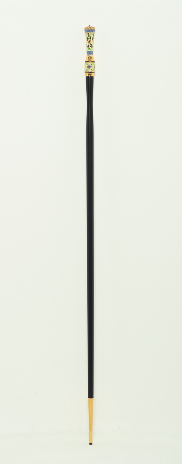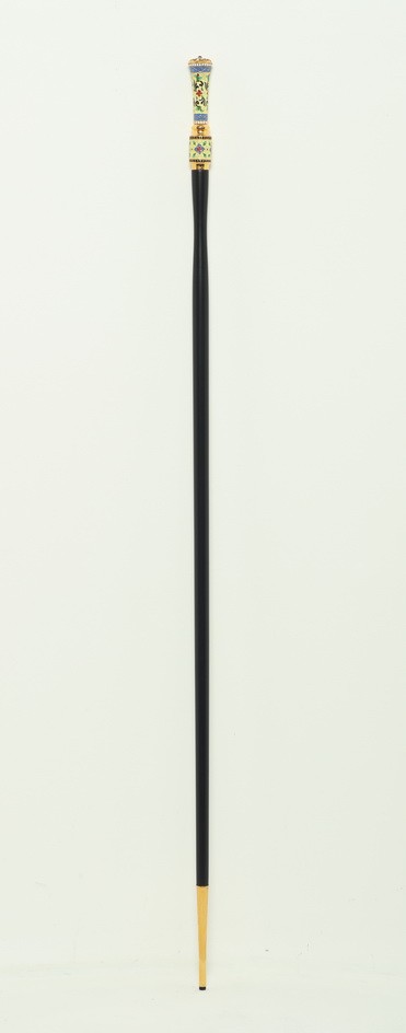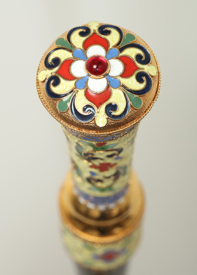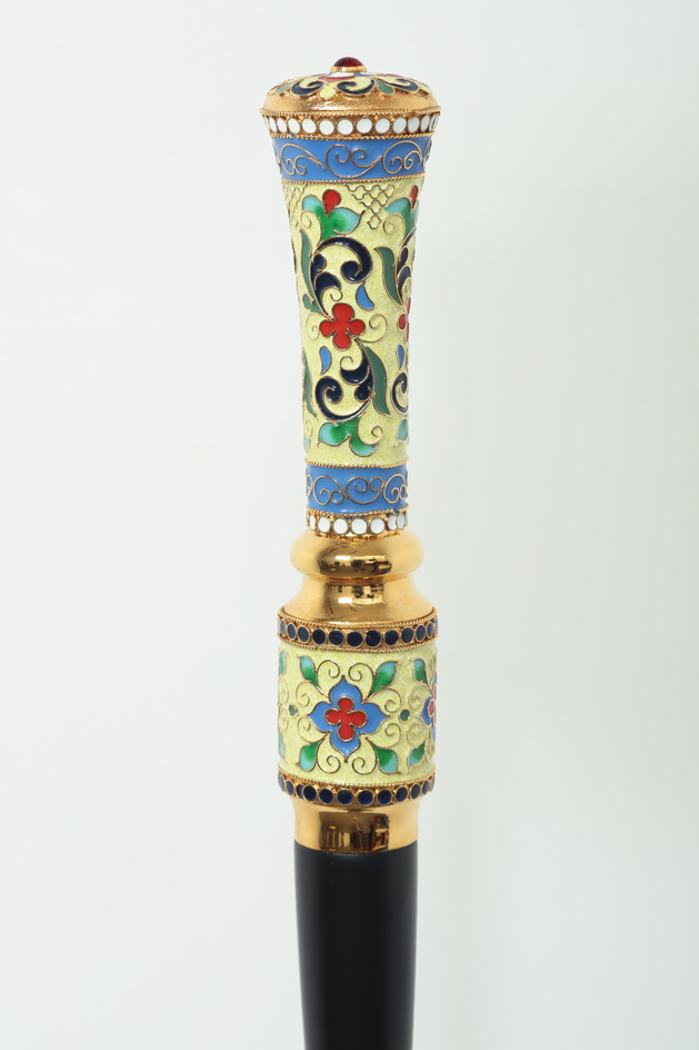 Упакованный в бархатный футляр, данный посох станет прекрасным подарком для архиерея. На золотом фоне медно-латуневого набалдашника ярко выделяются растительные филигранные узоры, яркая эмаль и сверкающие камни. Под оглавием черное липовое древко имеет рельефное сужение, облегчающее захват посоха рукой. Снизу посох имеет медное завершение, которое уберегает изделие от деформации при контакте с землей.