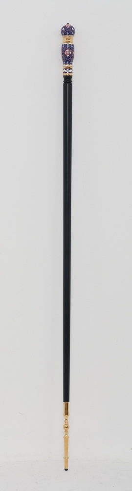 Черный липовый посох увенчан изящным медным набалдашником, украшенным тонкой филигранью, яркой эмалью и объемными камнями. Снизу деревянное древко посоха имеет медное завершение, которое будет уберегать изделие от деформации. Упакованный в бархатный футляр, посох станет хорошим подарком для архиерея.