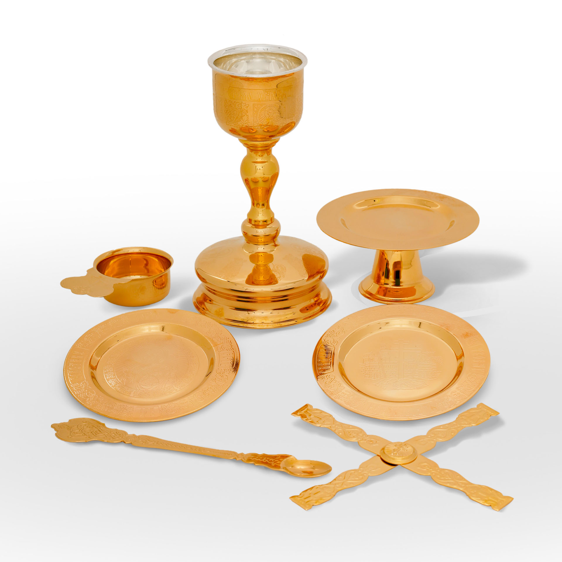 Набор состоит из предметов, употребляемых при совершении Таинства Евхари́стии: потира (чаши для Причастия), дискоса (сосуда для положения Агнца), звездицы (две металлические дуги, соединенные в центре, которые крестообразно поставляются на дискос), лжицы (ложка для причащения мирян), двух тарелей и ковша под теплоту.