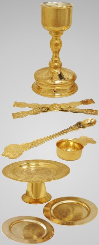Набор состоит из предметов, употребляемых при совершении Таинства Евхари́стии: потира (чаши для Причастия), дискоса (сосуда для положения Агнца), звездицы (две металлические дуги, соединенные в центре, которые крестообразно поставляются на дискос), лжицы (ложка для причащения мирян), двух тарелей и ковша под теплоту. Также рекомендуется приобрести копие малое и большое. Изделия выполнены в одном стиле и очень гармонично смотрятся вместе. Благодаря классическому дизайну, комплект впишется в интерьер любого храма. Все декоративные элементы, которыми украшены изделия, выполнены методом химической гравировки.