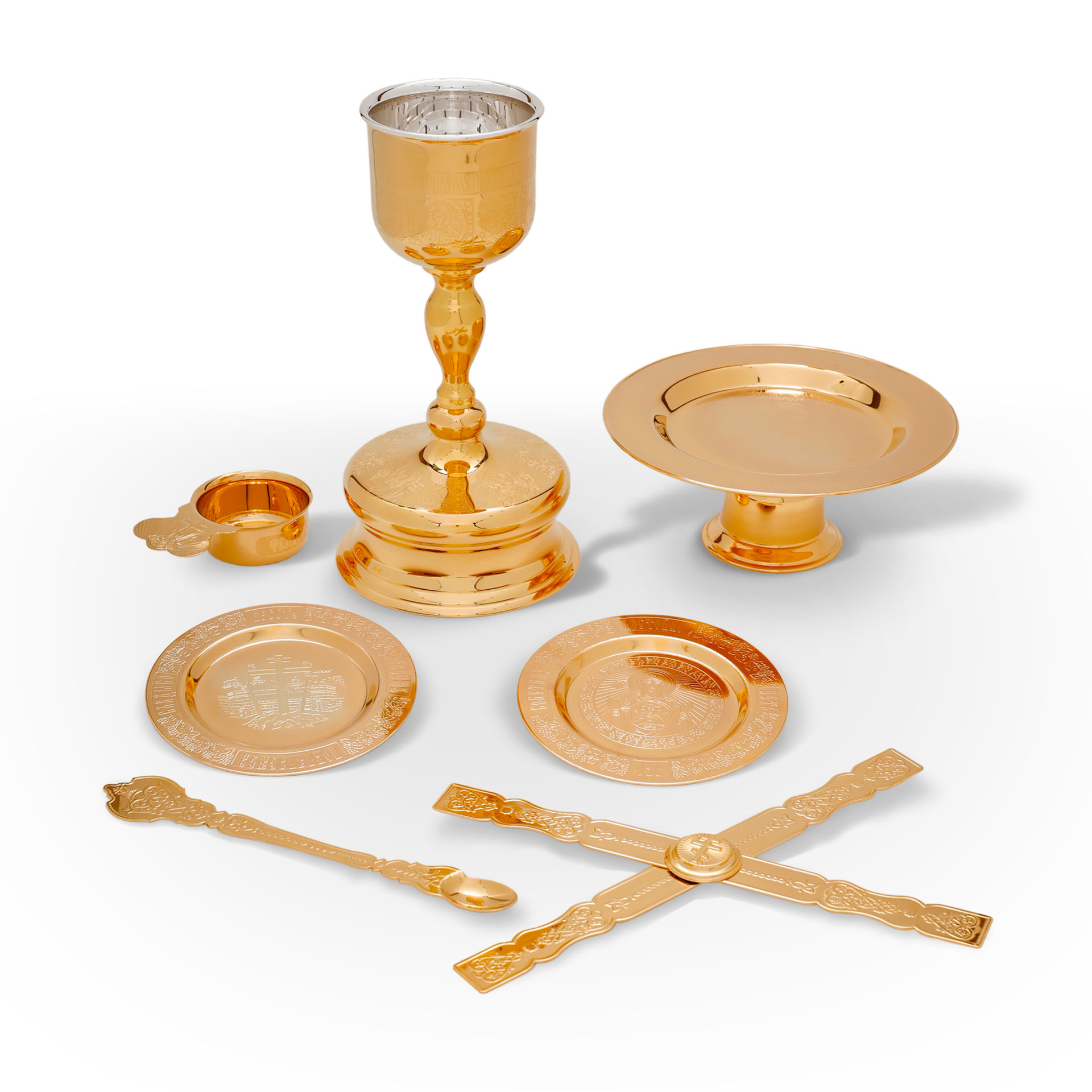 Набор состоит из предметов, употребляемых при совершении Таинства Евхари́стии: потира (чаши для Причастия), дискоса (сосуда для положения Агнца), звездицы (две металлические дуги, соединенные в центре, которые крестообразно поставляются на дискос), лжицы (ложка для причащения мирян), двух тарелей и ковша под теплоту.