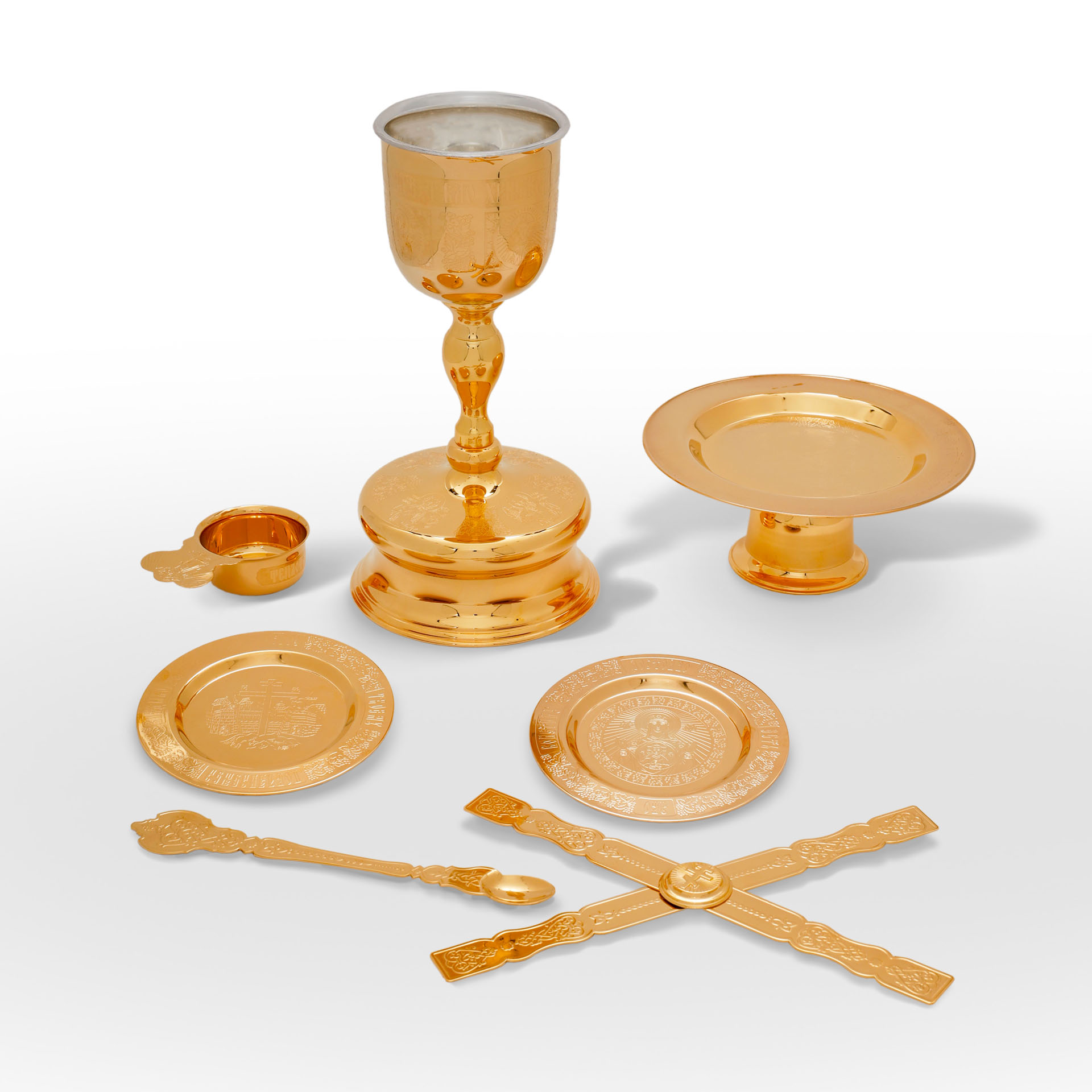 Набор состоит из предметов, употребляемых при совершении Таинства Евхари́стии: потира (чаши для Причастия), дискоса (сосуда для положения Агнца), звездицы (две металлические дуги, соединенные в центре, которые крестообразно поставляются на дискос), лжицы (ложка для причащения мирян), двух тарелей и ковша под теплоту.