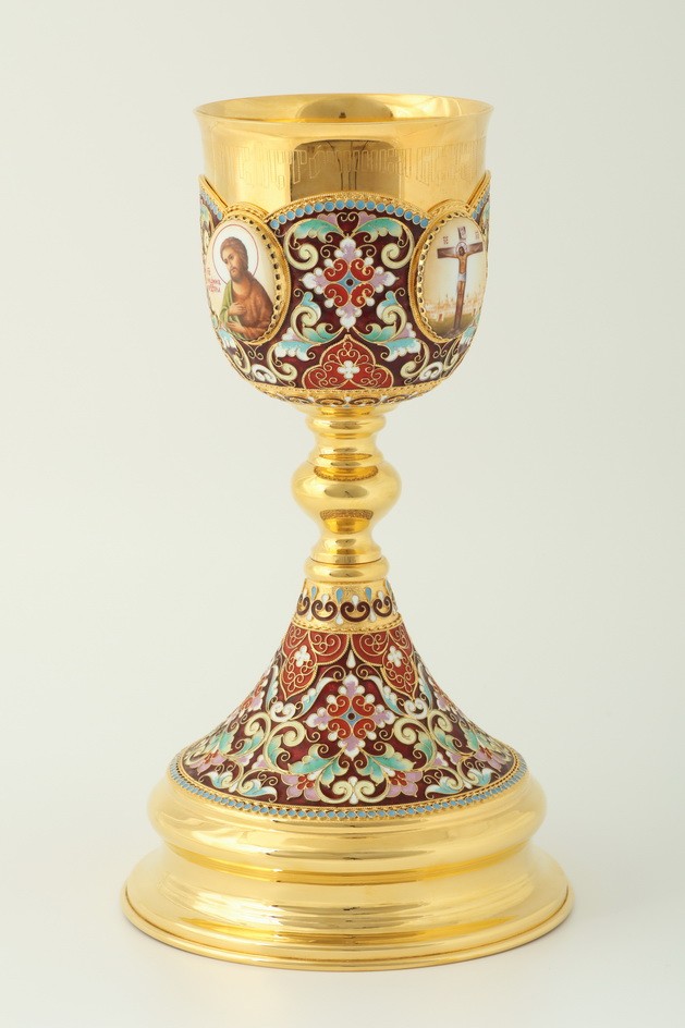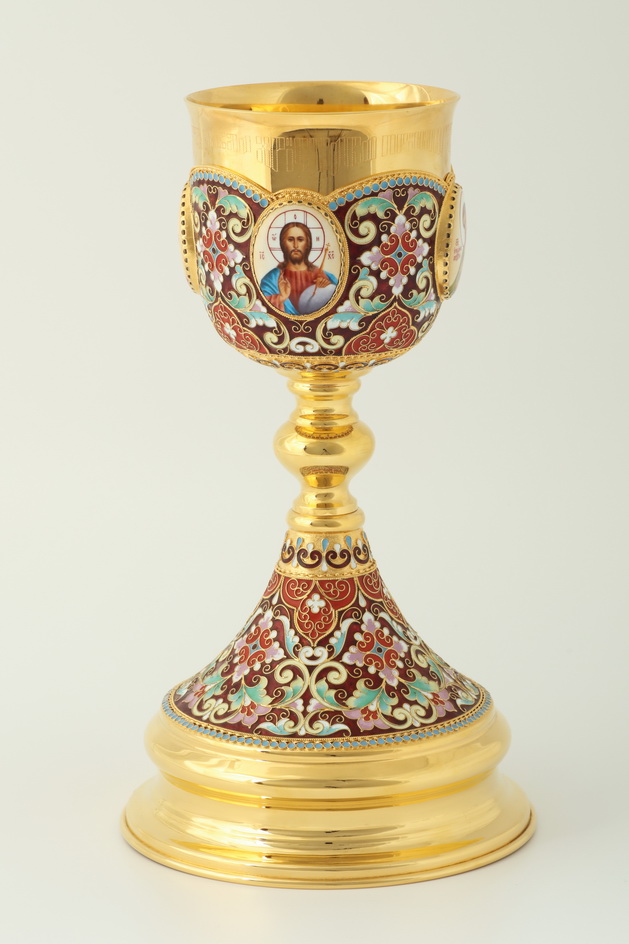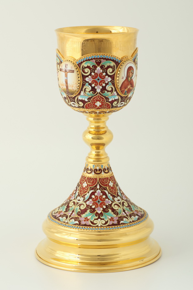Праздничный потир объемом 0,75 л выполнен из латуни и меди и покрыт позолотой. Чаша украшена четырьмя медальонами с изображениями Христа, Божией Матери, Иоанна Предтечи и Креста Господня, выполненными методом финифти, а также словами молитвы, нанесенными лазерной гравировкой: «Тело Христово приимите, Источника Безсмертного вкусите». Устойчивая конусообразная ножка потира украшена филигранью и эмалью.