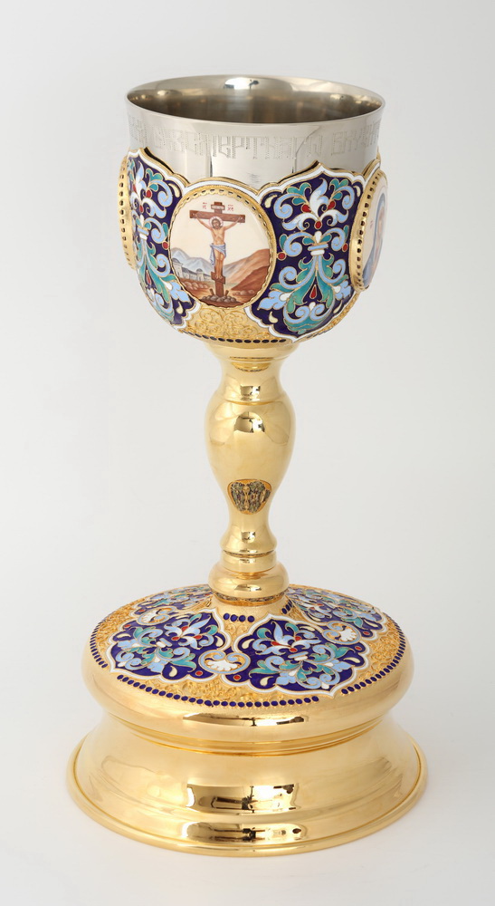 Благородный и минималистичный, потир выполнен из латуни и меди и покрыт позолотой. Внутренняя часть чаши, представляющая собой стакан, изготовлена из серебра. Сочетание золотого и серебряных цветов делает потир необычным и праздничным. Чаша украшена четырьмя медальонами с изображениями Христа, Божией Матери, Иоанна Предтечи и Креста Господня, выполненными методом финифти, а также словами молитвы, нанесенными лазерной гравировкой: «Тело Христово приимите, Источника Безсмертного вкусите».
