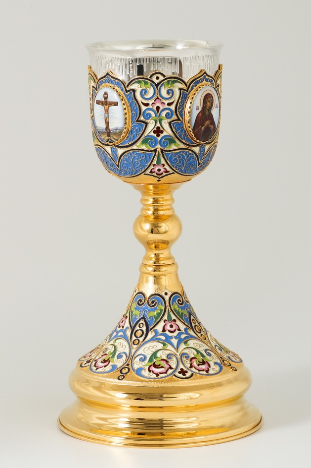 Потир 0.75л 4-финифти, филигрань, эмаль, роспись / поддон 1,5л потира / золочение / серебряный стакан (УИН)