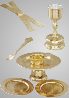 Набор состоит из предметов, употребляемых при совершении Таинства Евхари́стии: потира (чаши для Причастия), дискоса (сосуда для положения Агнца), звездицы (две металлические дуги, соединенные в центре, которые крестообразно поставляются на дискос), лжицы (ложка для причащения мирян), двух тарелей и ковша под теплоту.