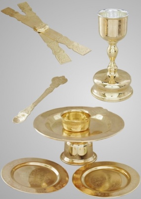 Также рекомендуется приобрести копие малое и большое. Полный евхаристический комплект имеет универсальный дизайн, который впишется в интерьер любого храма. Потир с вкладышем из нержавеющей стали имеет объем 1 л, чего хватит для совершения Евхаристии в среднем по размеру храме. Дискос, ковш для теплоты, лжица, звездица и два блюда – все изделия выполнены в одном стиле и очень гармонично смотрятся вместе.