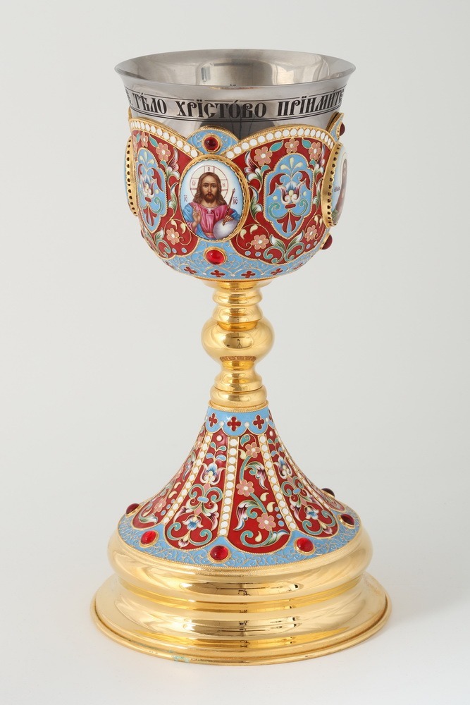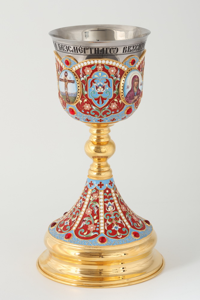 Основание праздничного потира, выполненного из латуни и меди, украшено эмалевыми узорами, филигранными орнаментами, выпуклыми камнями и четырьмя иконами-медальонами, выполненными методом финифти. Внутренняя часть чаши, изготовленная из нержавеющей стали, представляет собой стакан, на кайме которого написаны слова молитвы: «Тело Христово приимите, Источника Безсмертного вкусите». Объем потира составляет 1 л.