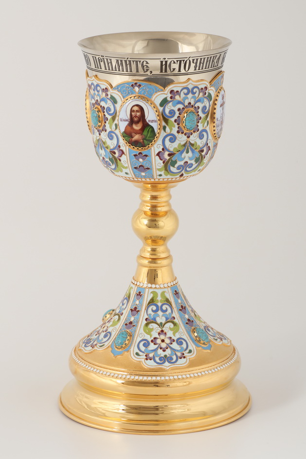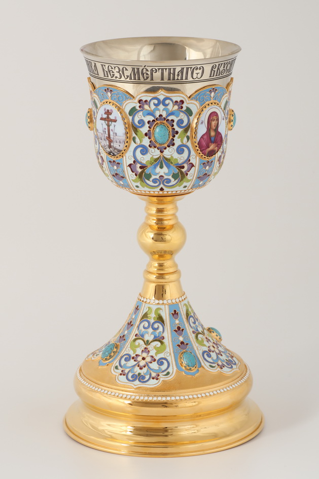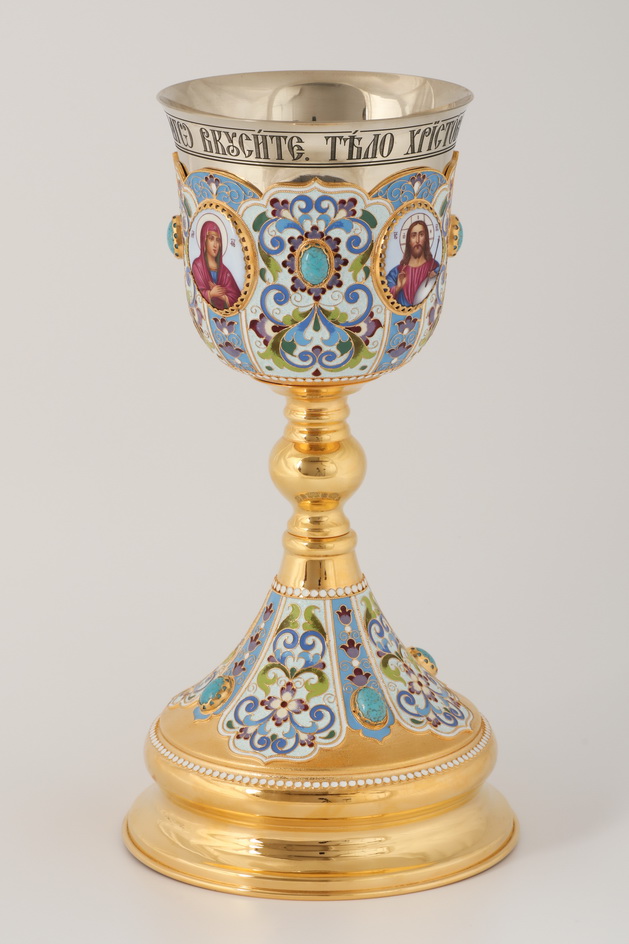 Богато украшенный потир, сочетающий в себе различные материалы и техники, станет настоящим украшением богослужения. Выполненный из мельхиора и меди, потир покрыт позолотой, а его внутренняя часть – чернением. Чаша украшена четырьмя медальонами с изображениями Христа, Божией Матери, Иоанна Предтечи и Креста Господня, выполненными методом деколи. На кайме внутреннего стакана написаны слова молитвы: «Тело Христово приимите, Источника Безсмертного вкусите». Во избежание появления темных пятен на изделиях из мельхиора требуется его надлежащая эксплуатация и уход. Чтобы избежать потемнения изделий из мельхиора, следует сразу после мытья насухо протирать метал мягкой тканью. Каждая капля воды, высохшая на поверхности из мельхиора естественным путем, оставит после себя темную окись.