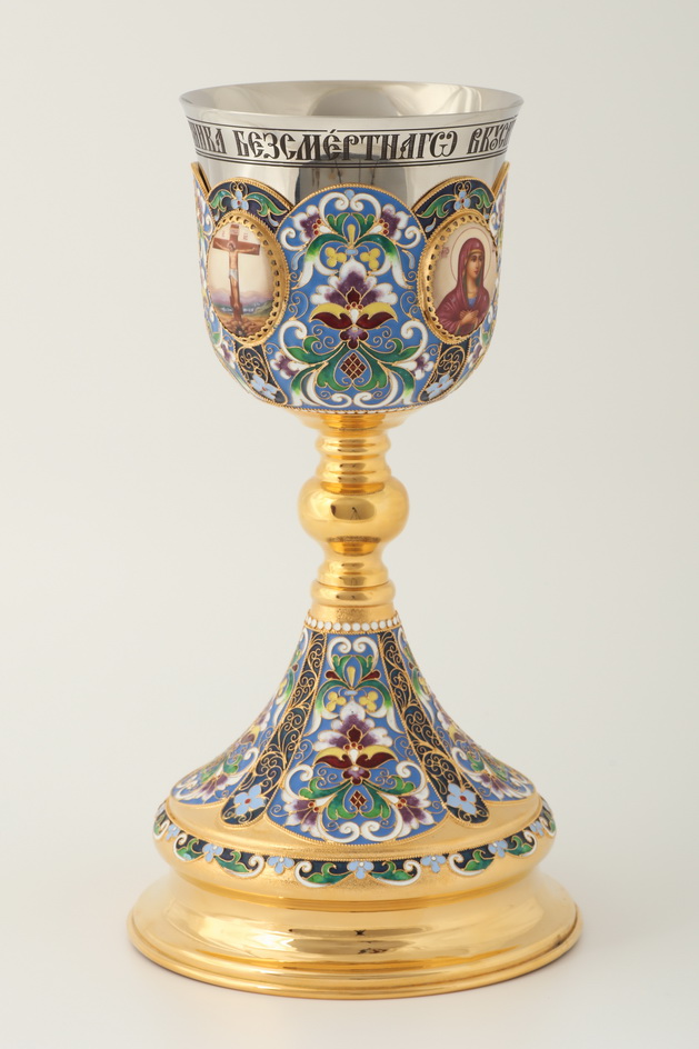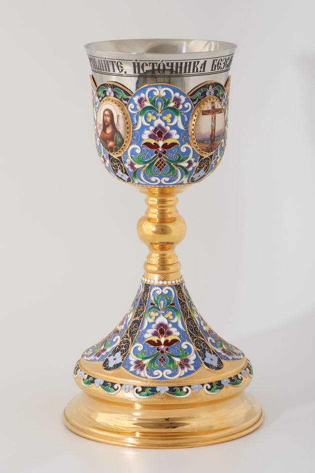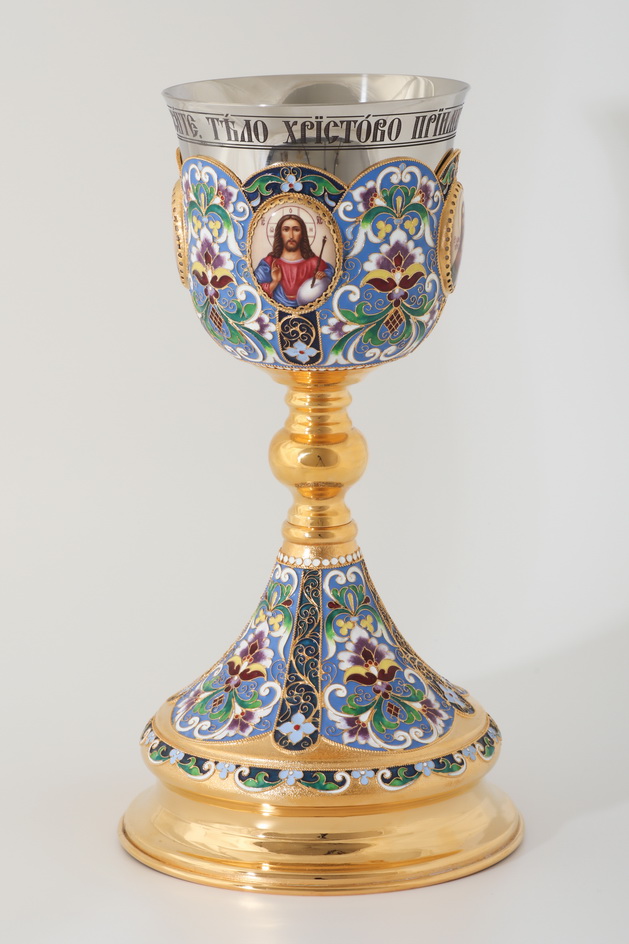 Яркий благородный потир выполнен из латуни и меди, а его внутренняя часть – из нержавеющей стали. Чаша украшена четырьмя медальонами с изображениями Христа, Божией Матери, Иоанна Предтечи и Креста Господня, выполненными методом финифти. Тонкие филигранные орнаменты раскрашены цветной эмалью сине-зеленых оттенков. Размеры потира составляют 320х175х320 мм.