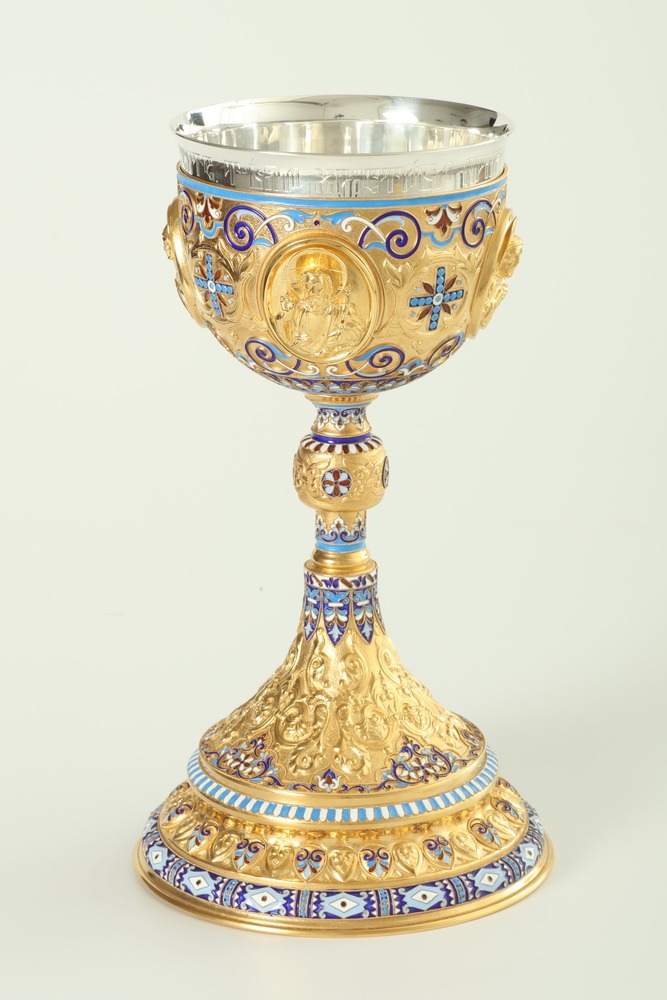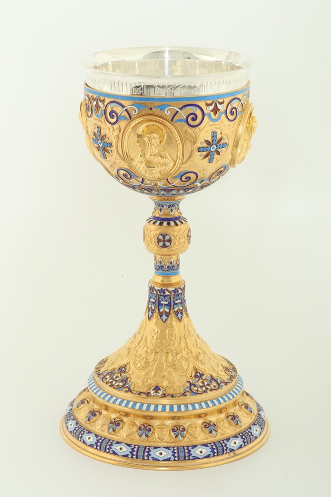 Потир 1.0л 4-литьевых лика, филигрань эмаль, чеканка "№13 / 7" / золочение / серебро (УИН)