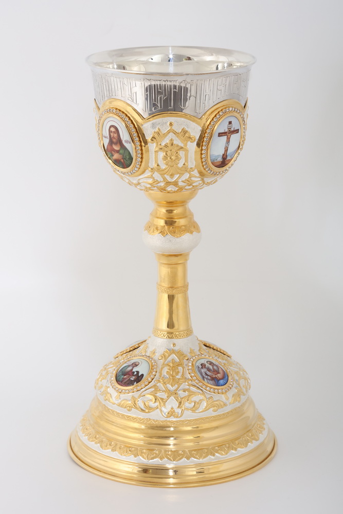Потир 1.0л 8-финифтей, чеканка / поддон песочные часы / золочение / серебро (УИН)